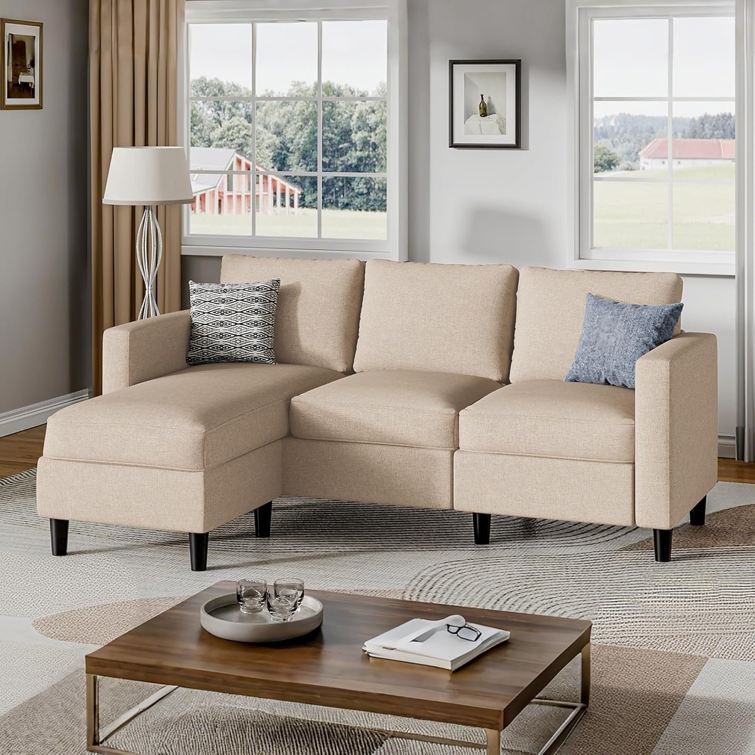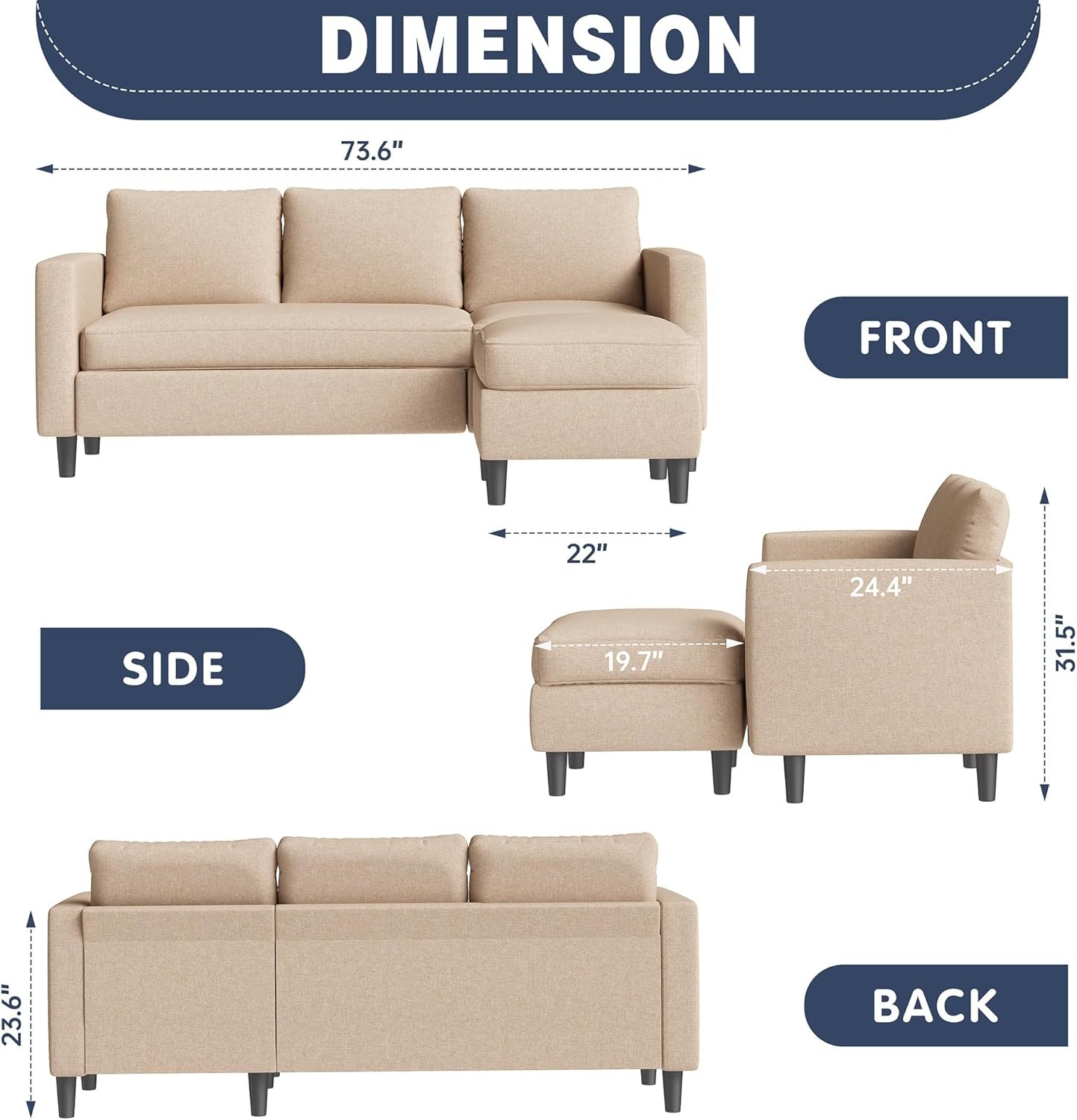 Comfortable Sectional Sofa: The sofa is made of modern linen fabric with a hardwood frame as the basic structure. The linen fabric is comfortable and not easy to pilling, fading. The cushions you sit on are nice and firm. You’ll never have to worry about sinking in.