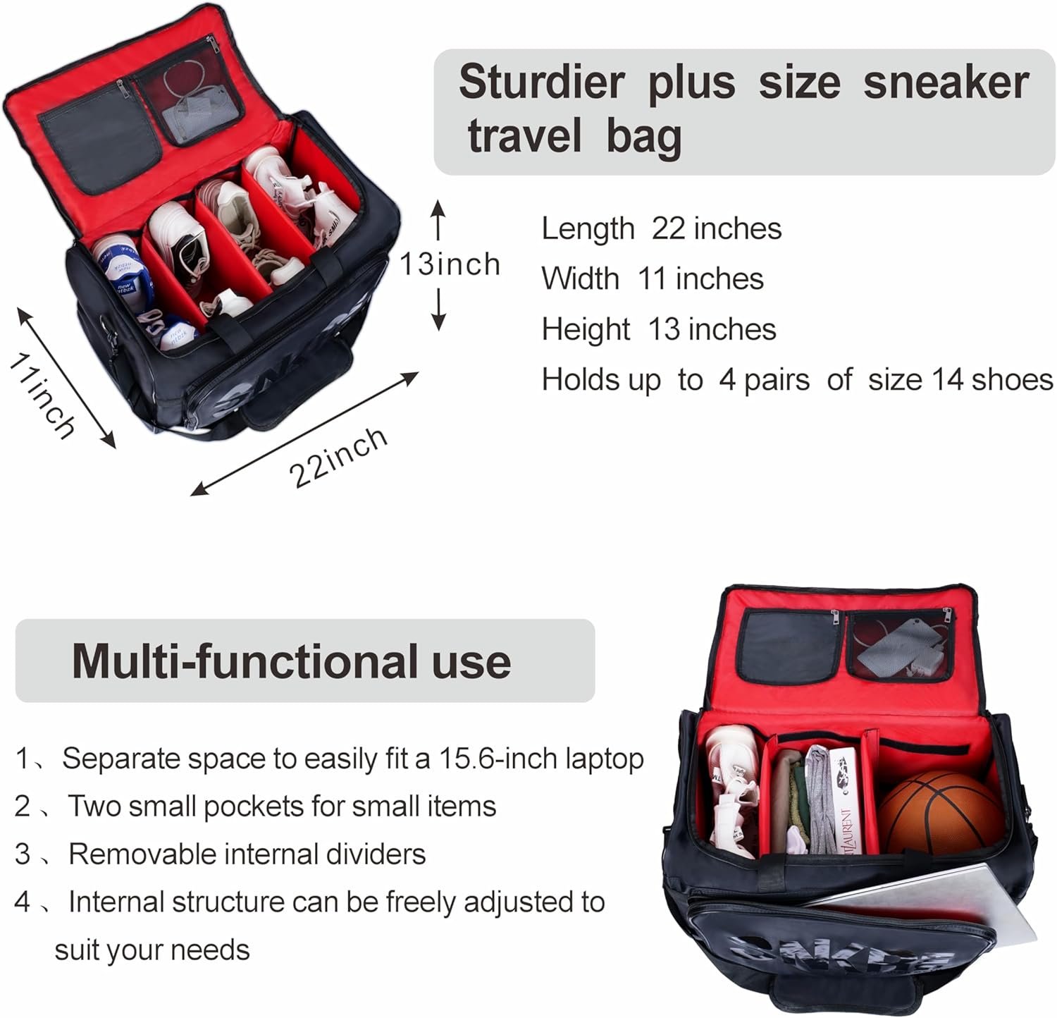 [WIDELY USED] Our extra large Sneaker Bag for Travel measures 22″ x 11″ x 13″ in size and can hold up to 4 pairs of shoes (size 14). Additionally, this bag features 3 removable dividers, allowing you to customize the storage compartments according to your preferences. It has ample space to accommodate a wide range of items, including a basketball, a laptop computer, clothes, and more, and can also serve as a shoe bag, basketball bag, gym bag, fitness bag, and soccer bag. So, it is the ultimate companion for all your travel and outdoor activities.