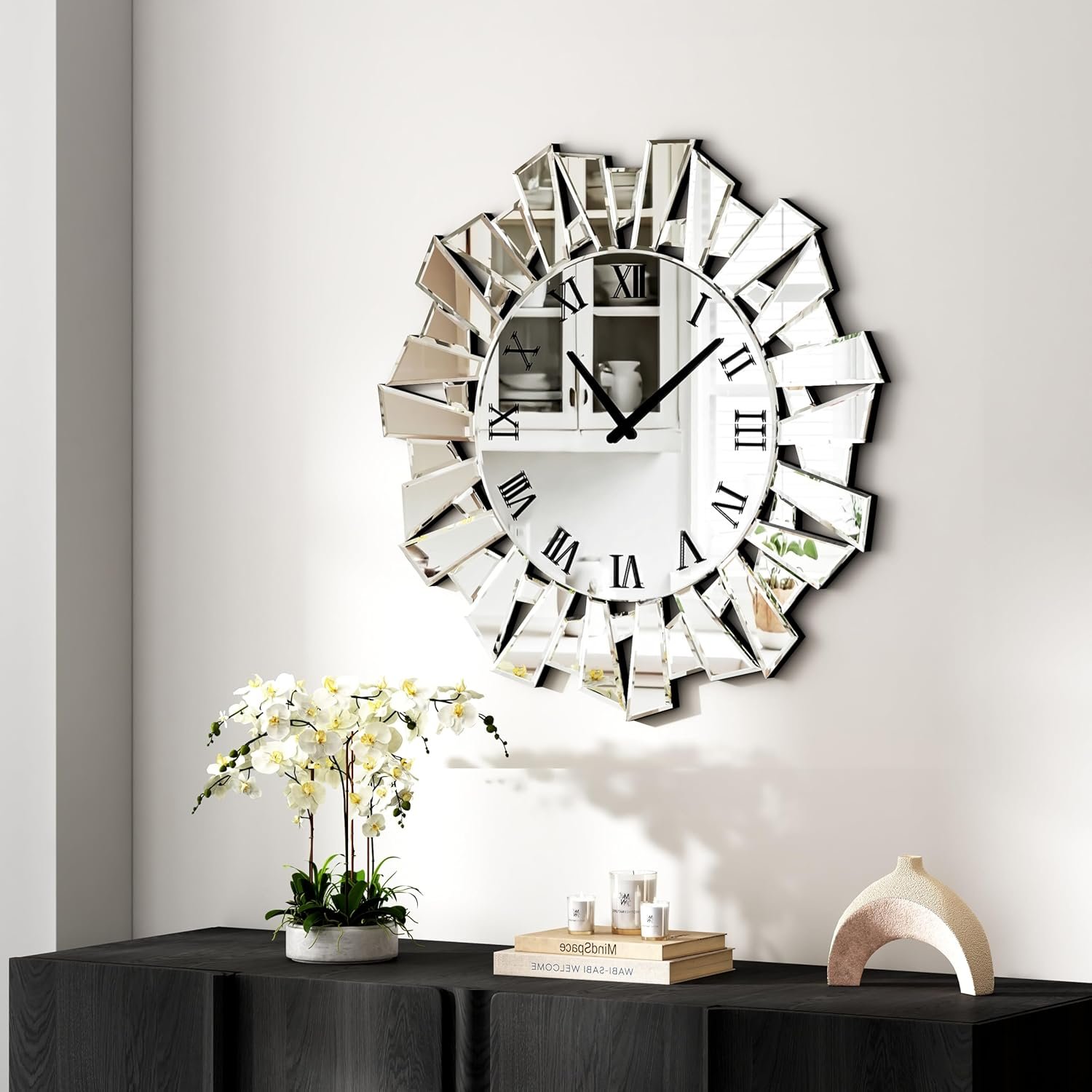 Timeless Roman Numerals – Classic Meets Contemporary: Designed with sleek Roman numerals, this mirror wall clock perfectly blends contemporary style with classic elegance. The ultra-silver mirrored surface provides a crisp, clear reflection, adding a luxurious touch to any modern interior.