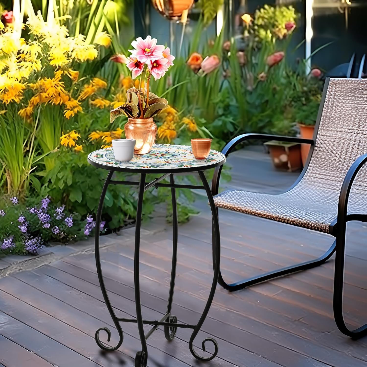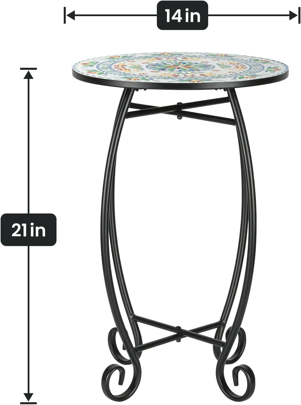 【A Perfect Addition to Your Place】This indoor side end table offers a stunning blend of colorful ceramic tile tabletop with classic black metal scrollwork frame, making a perfect addition to your home and adding a touch of charm to your room.