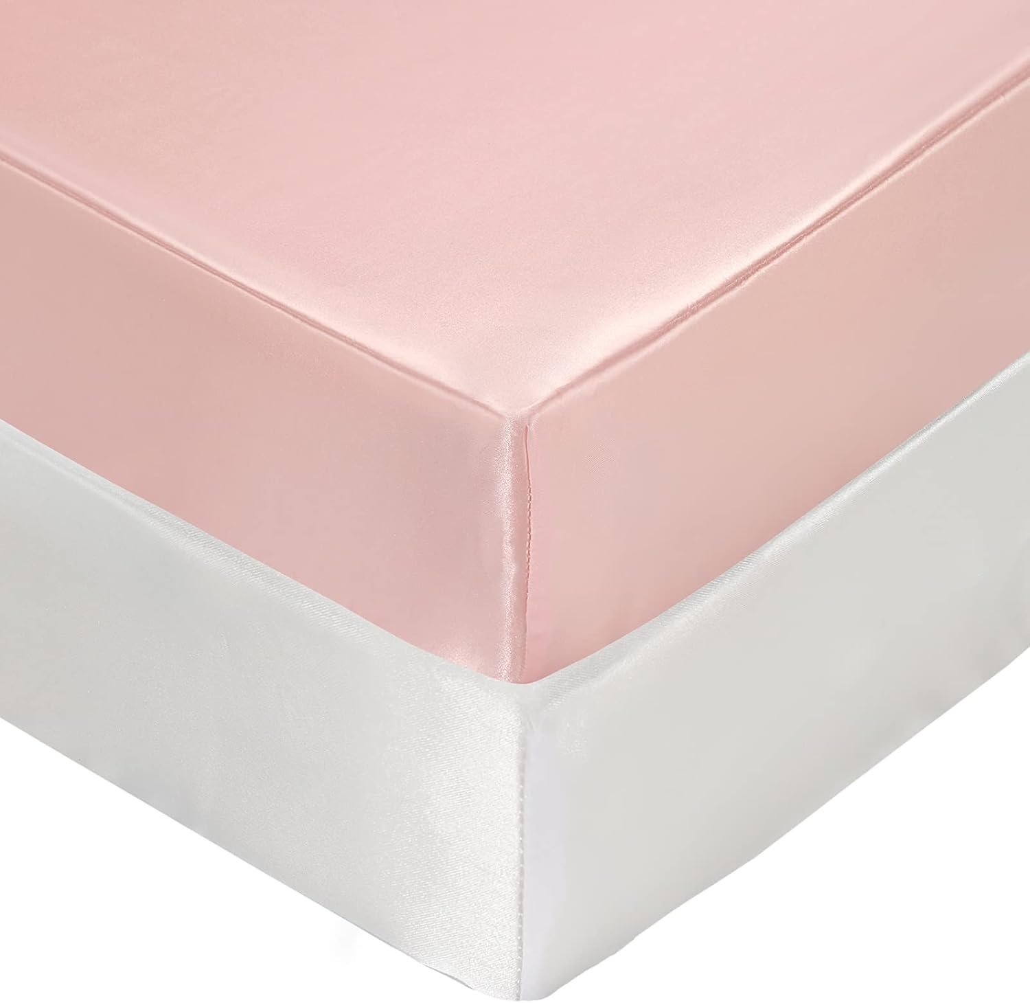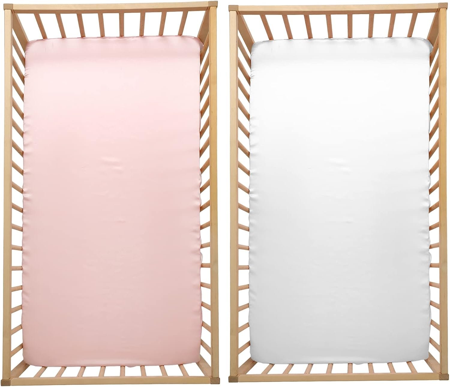 SiinvdaBZX 2 Pcs Satin Mini Crib Sheets 38 x 24In, Silky Soft Mini Portable Crib Sheets Mattress Cover Portable Playard Sheets with 5In Deep Pocket, Great for Baby Hair (Pink & White)