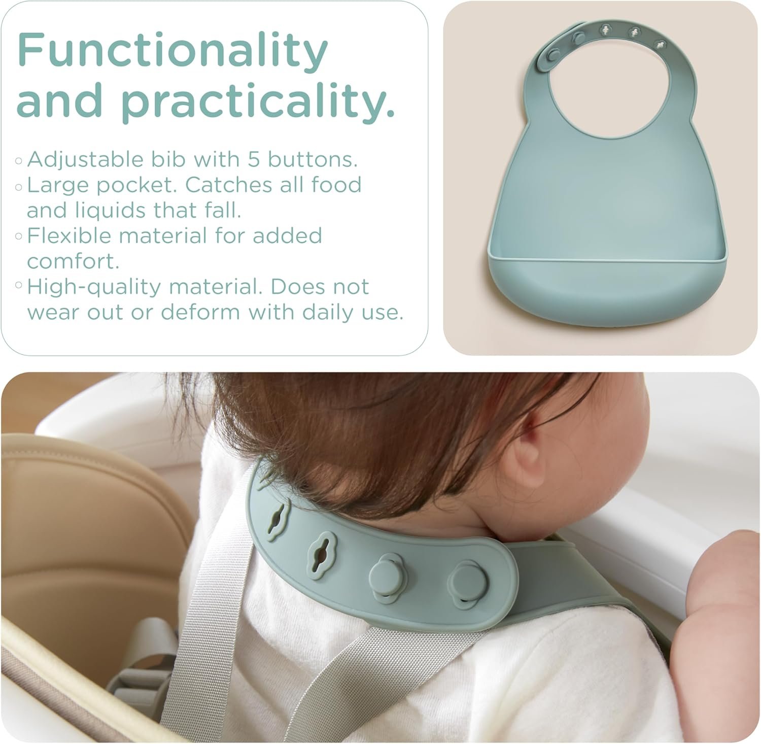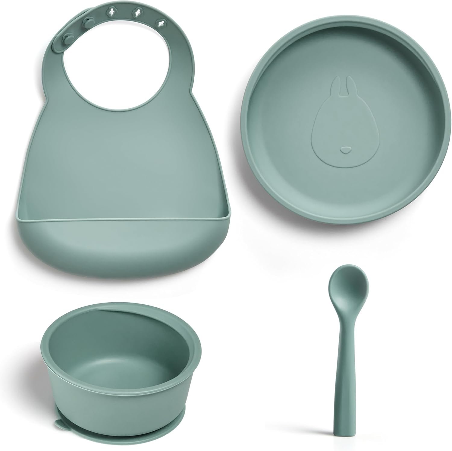 Silicone Baby Feeding Set, Toddler Plates and Bowls Set, Baby Feeding Set with Adjustable Bib Grey