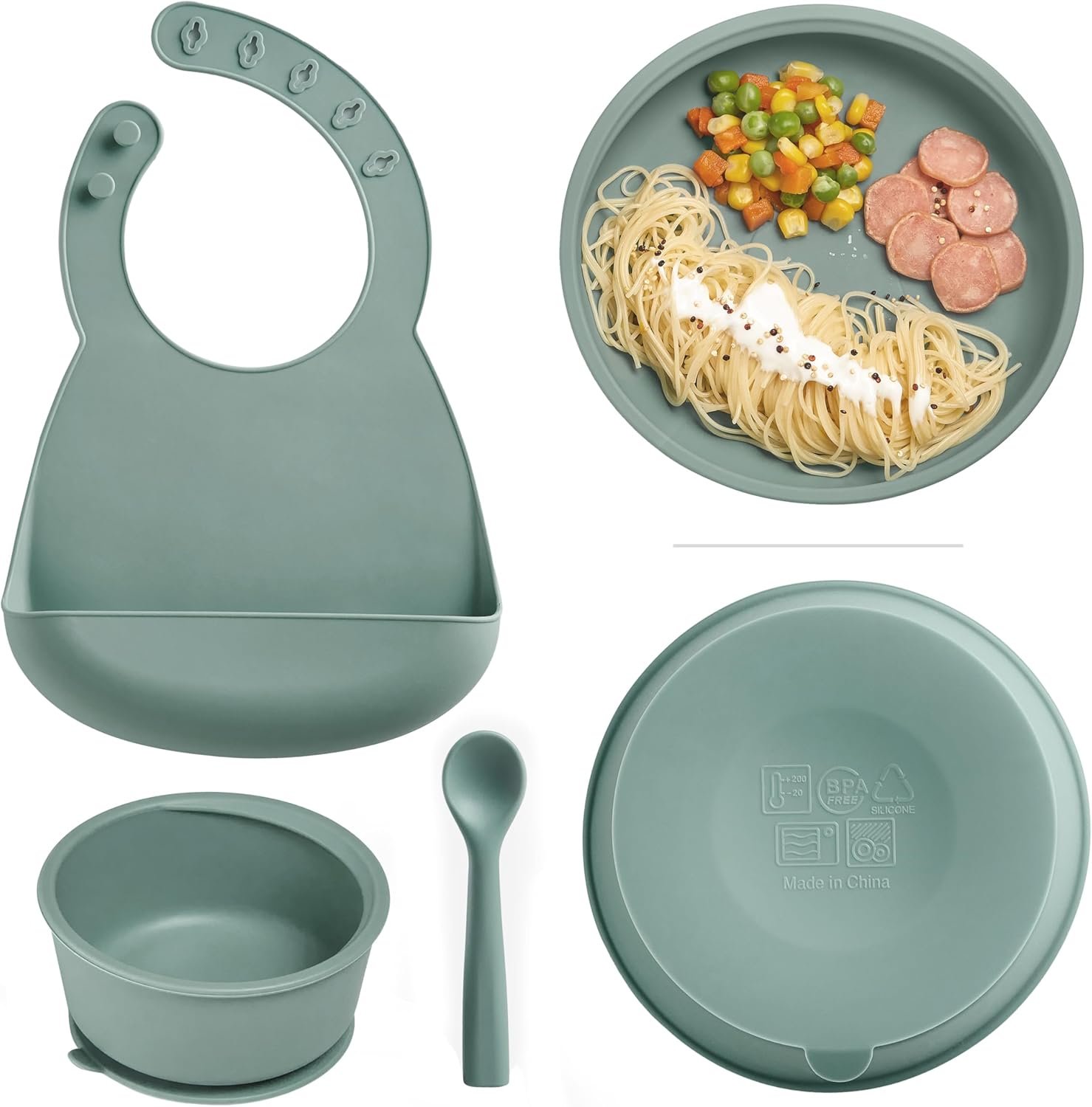 【Easy to Clean】- Our kids plates and bowls sets catches all dropped food, making it easy to keep your baby’s clothes spotless. Post-meal, simply empty feeding set, along with the entire silicone set, in the dishwasher for quick and easy cleaning.