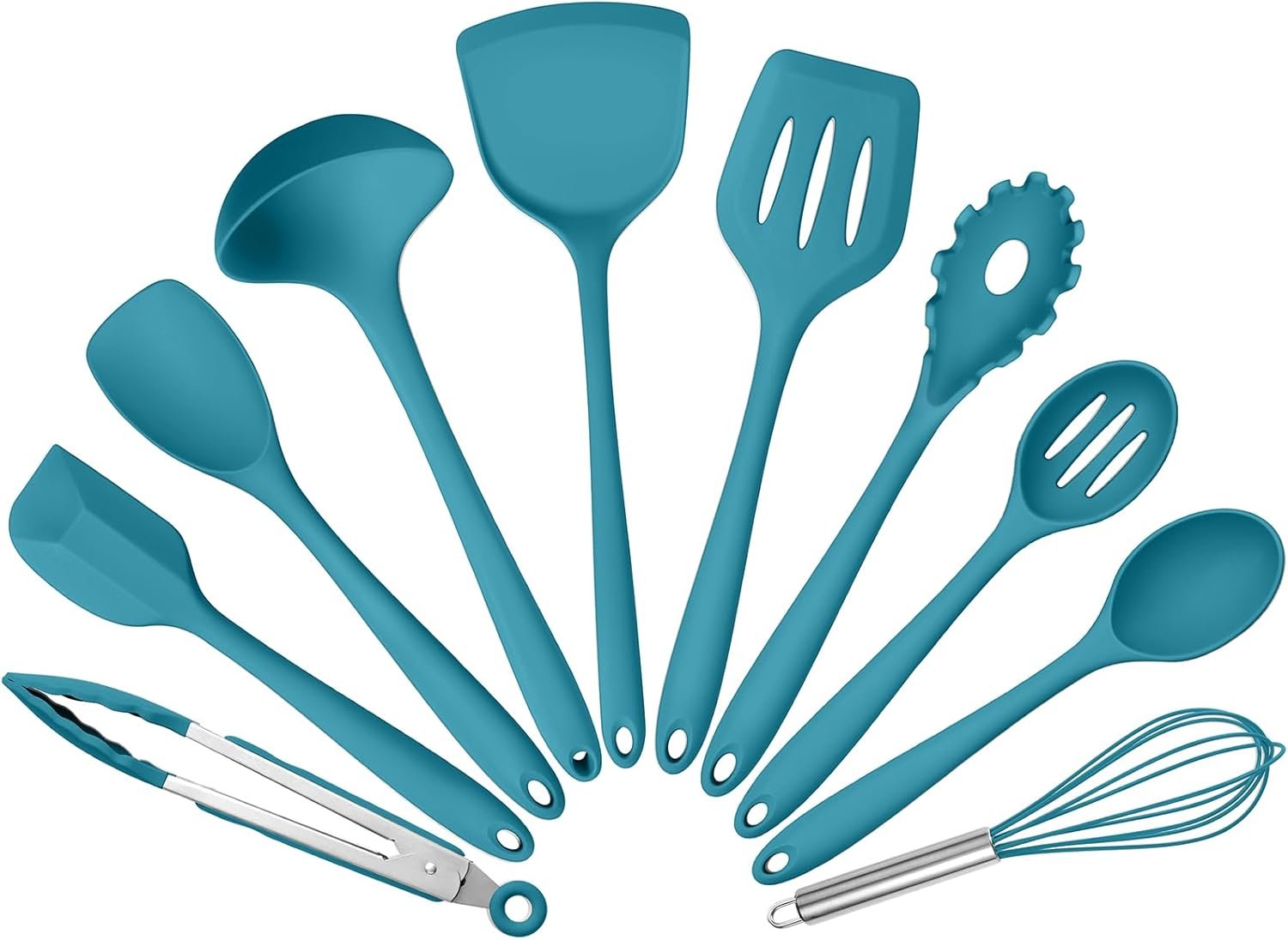 Silicone Cooking Utensils Set of 10, Kitchen Utensils Set for Cooking, 446°F Heat Resistant Silicone Kitchen Tools with Turner Spatula, Soup Ladle, Serving Spoons, Tongs for Nonstick Cookware – Blue