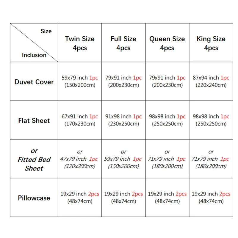 1 pcs duvet cover: 200 x 230 cm = 79 x 91 inch