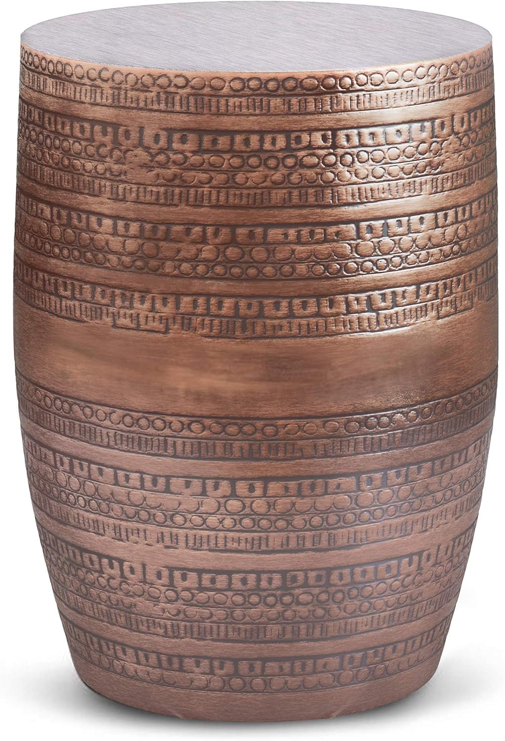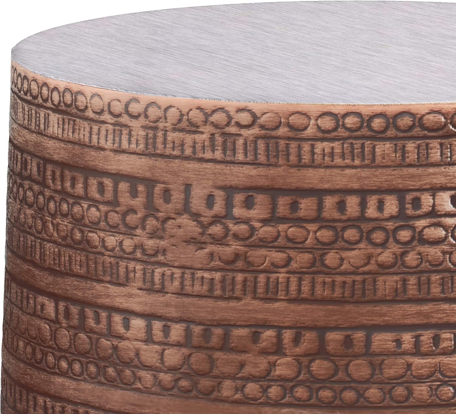 SIMPLIHOME Johnsen Metal Table – 15 inch Wide Solid Iron Drum Accent Table in Antique Copper with Tribal Pattern, Round Boho End Table for Living Room, Bedroom, or Home Office, Fully Assembled