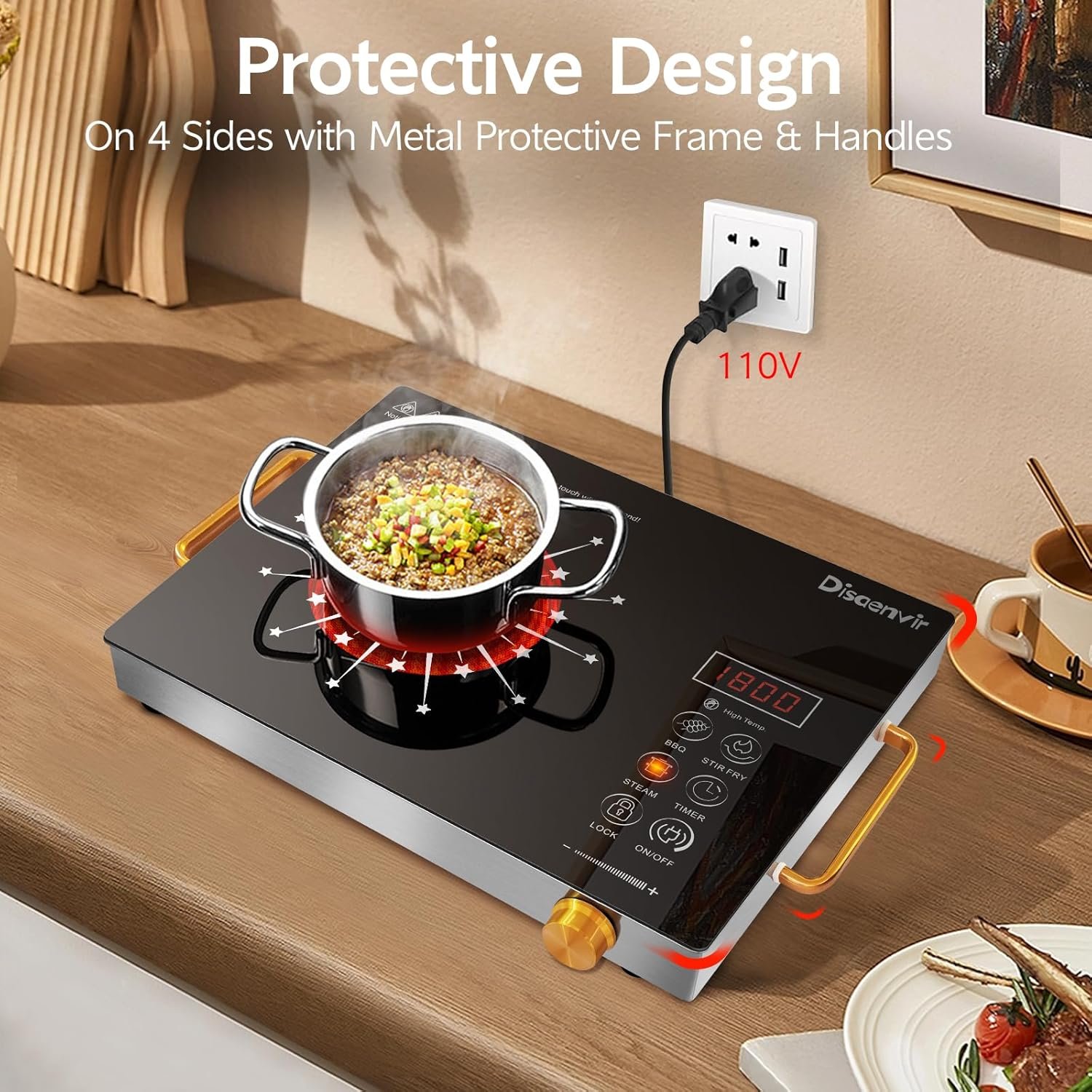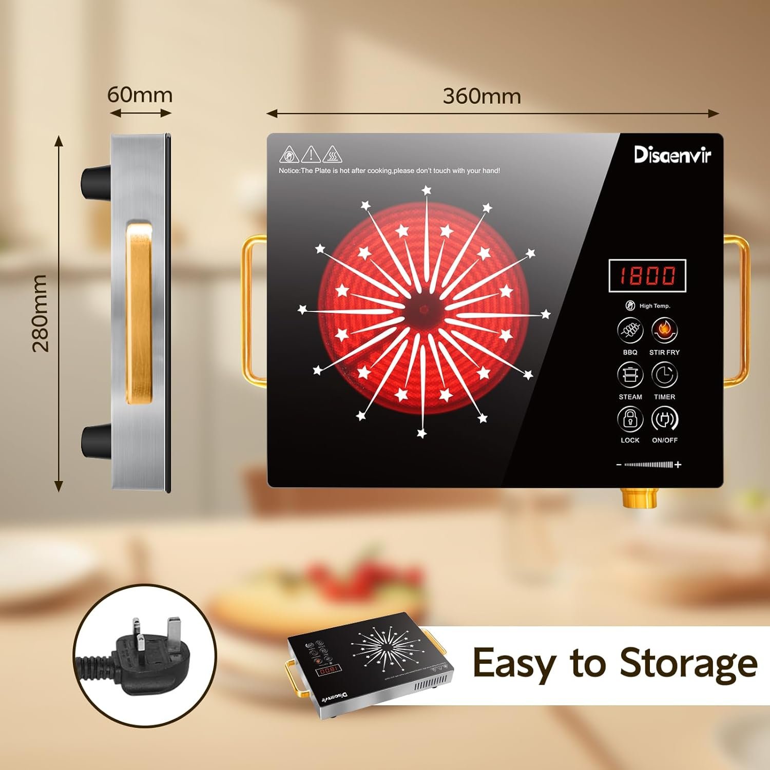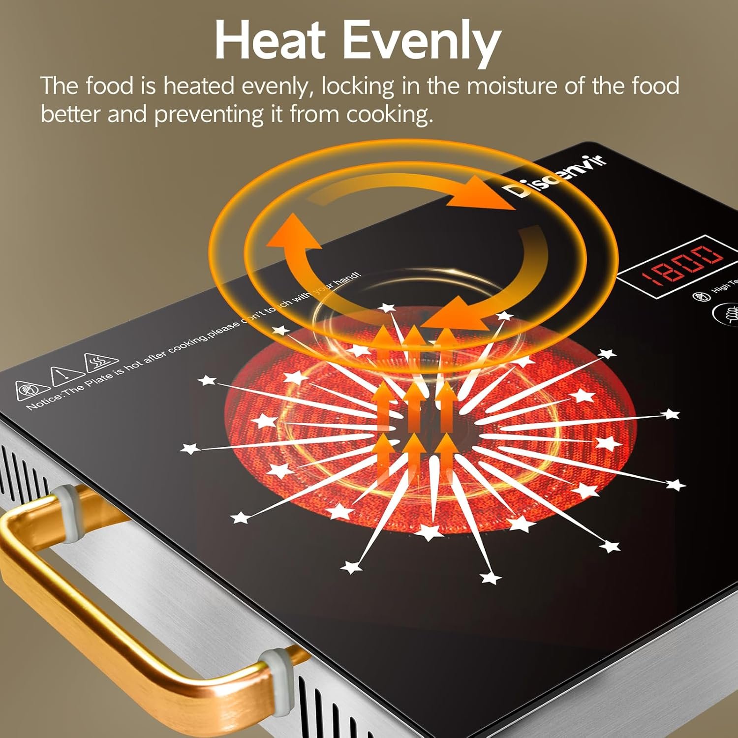 🎪| High-Performance 1800W Infrared Burner | The Disaenvir single burner electric cooktop boasts a robust 1800W infrared heating element for swift and efficient cooking. This powerful cooktop is engineered to handle a range of cooking tasks with ease, ensuring that even the most demanding culinary techniques are executed with precision and speed.