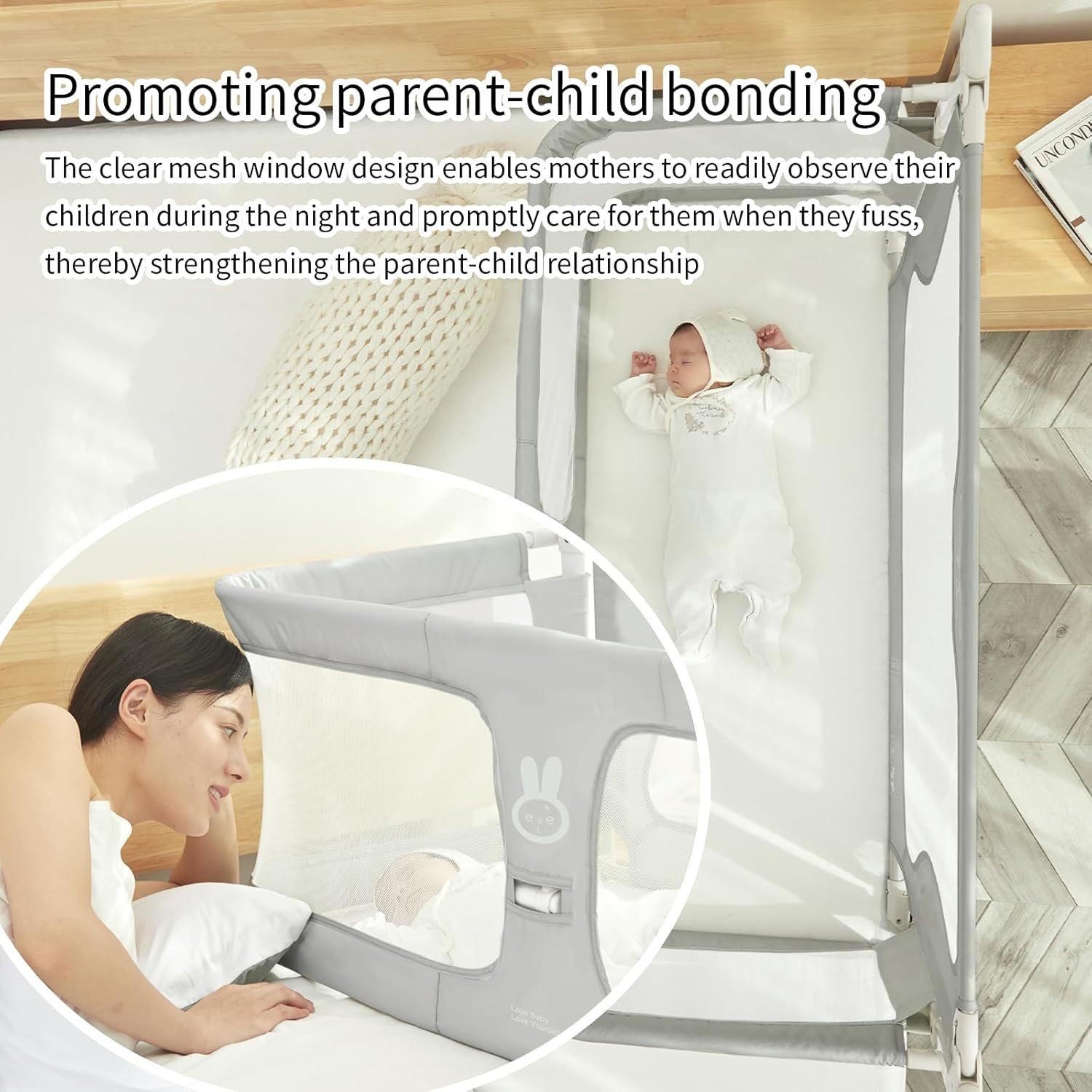 Multifunctional: This bassinet combines the functions of a bedside cot and a bed rail, suitable for parents to keep their babies beside them while they sleep. parents to pick up their child from the crib at night, no need to get up during the night, reducing the fatigue of mothers who breastfeed at night. The cot’s mesh-like design allows mothers to check on their babies at night and attend to them immediately when they cry. It also promotes bonding between parents and infants, so that your little one is right next to you