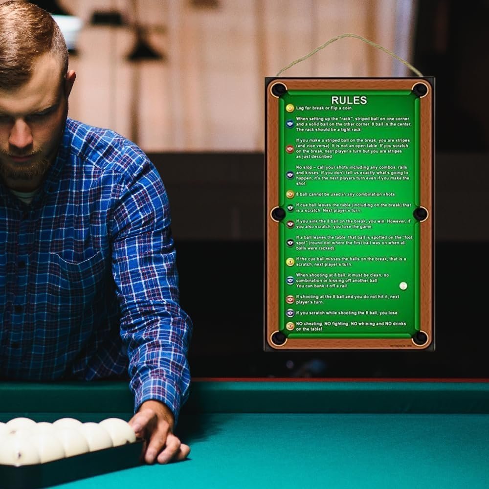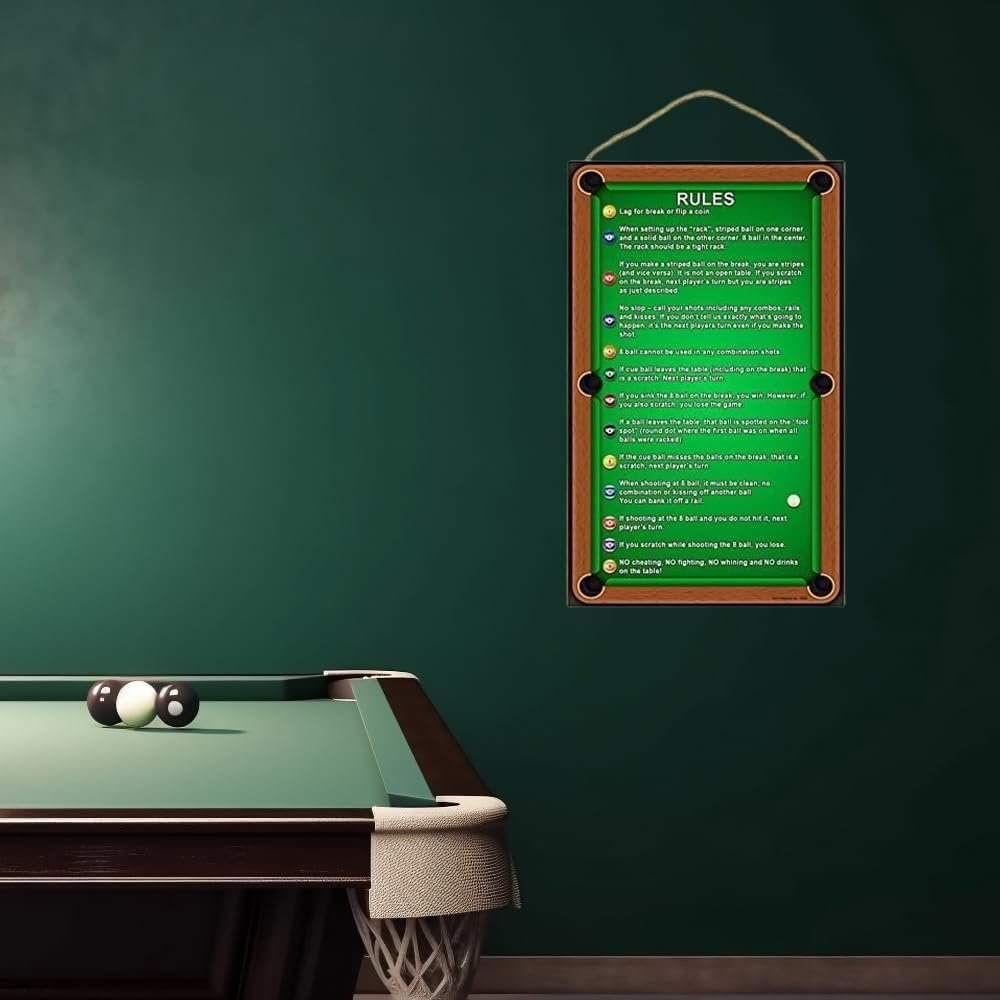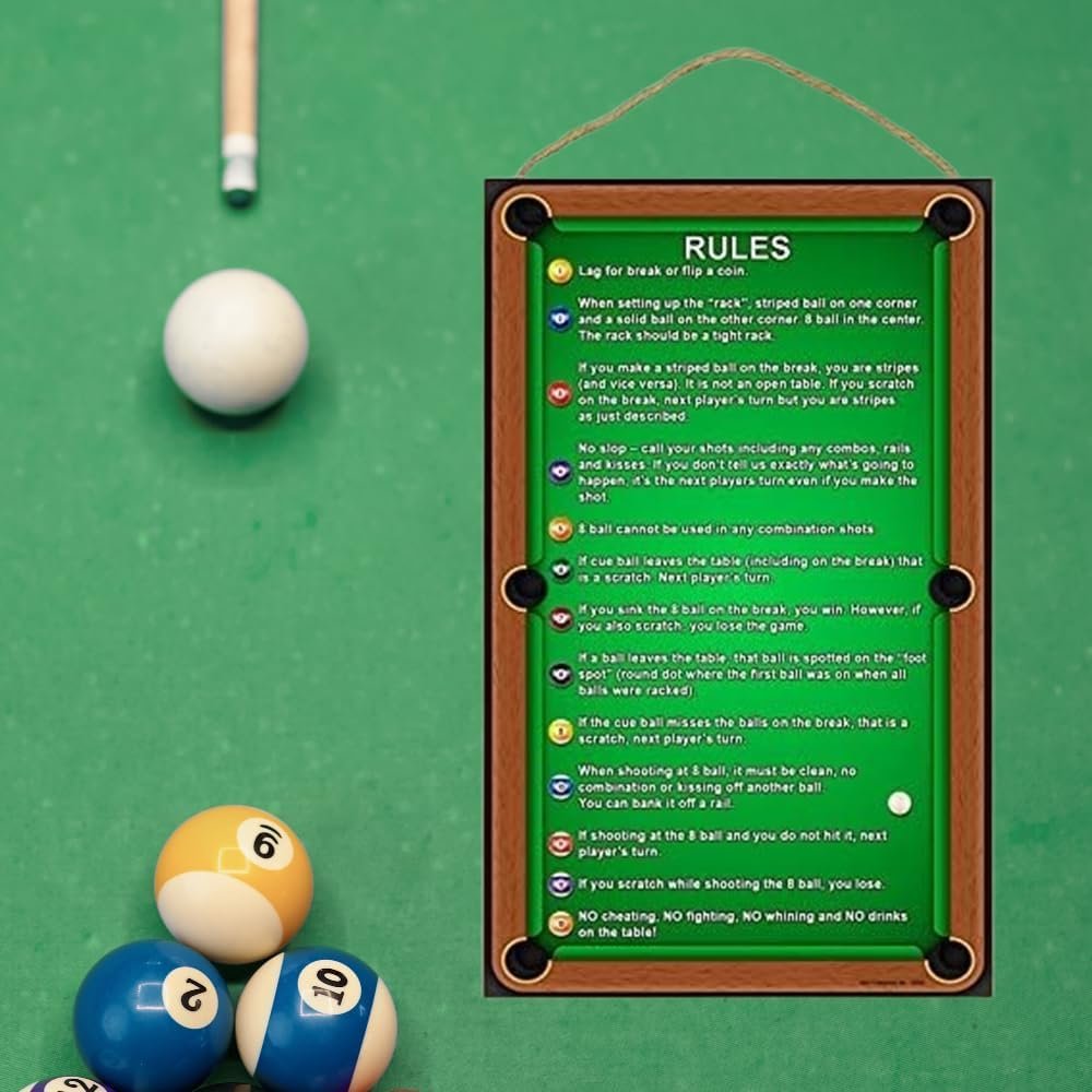 What’s a pool table without a rules plaque hanging on the wall? Make sure your friends and guests are all on the same page with this concise and clear ruleset for billiards! Perfect for amateur leagues and bars with pool games.