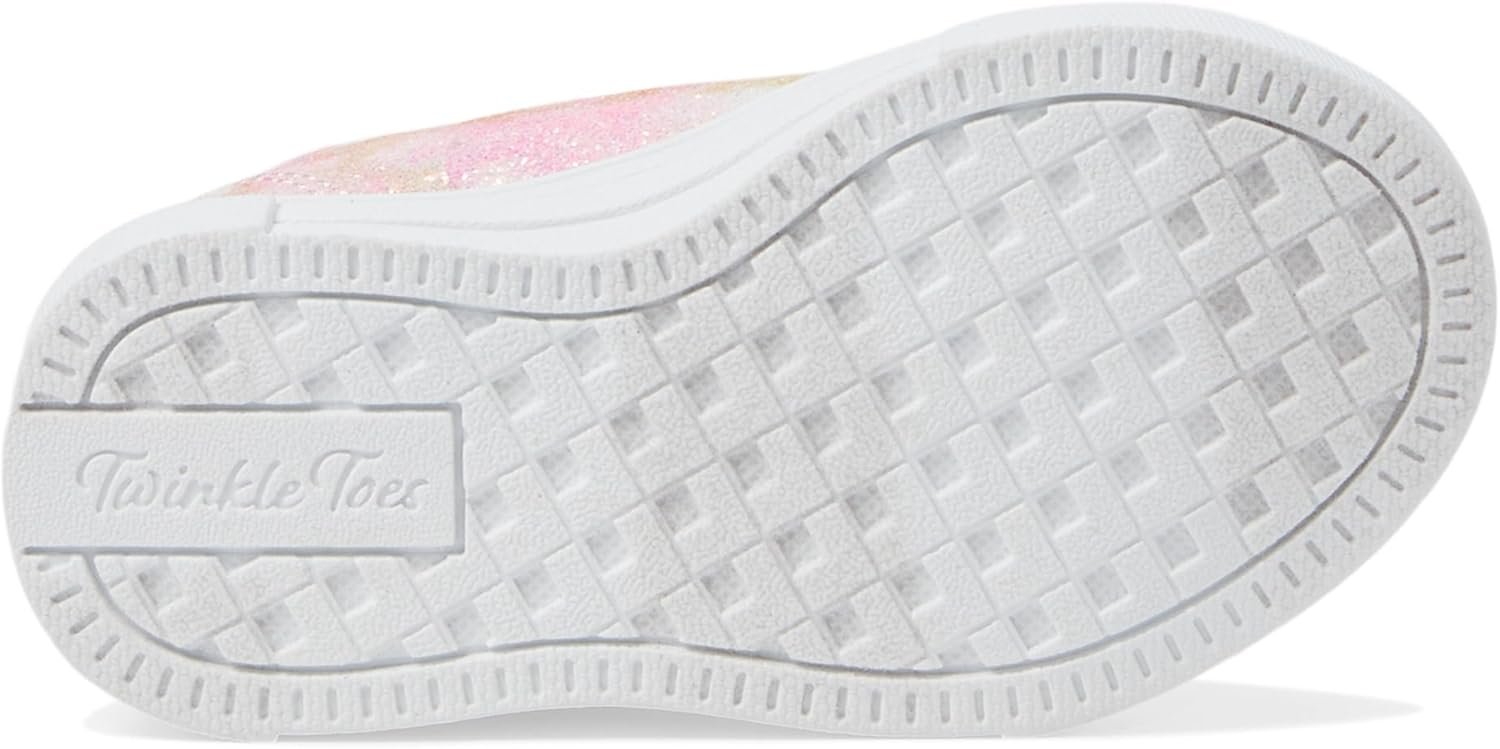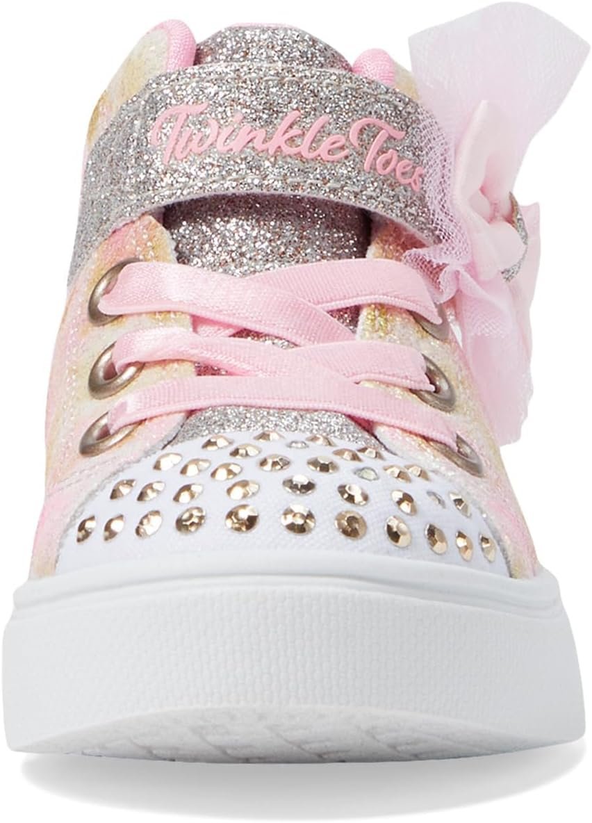 Take a superstar walk in the clouds that sparkles and shines with every step wearing Skechers Twinkle Toes®: Twinkle Sparks – Ombre Dazzle. This high-top sneaker features a glitter canvas upper with tulle and bow accent, a stretch lace front, adjustable instep strap, and a light-up rhinestone embellished toe cap.
