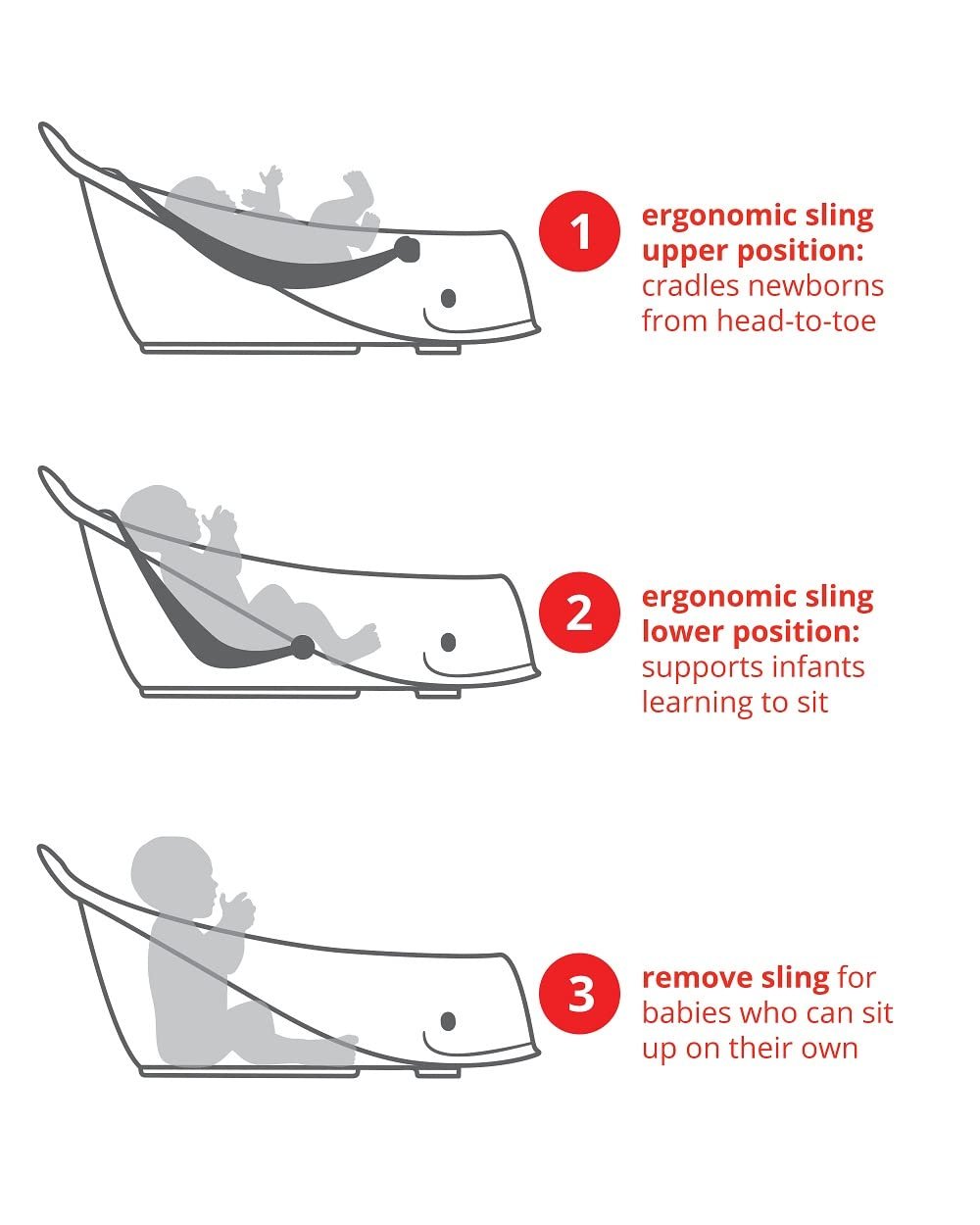 Smart Sling for Adjustable Comfort: The Mesh Smart Sling provides Comfort-Edge support. It locks into two ergonomic positions: an upper position for full-body cradling of newborns and a lower position for securely supporting infants as they learn to sit