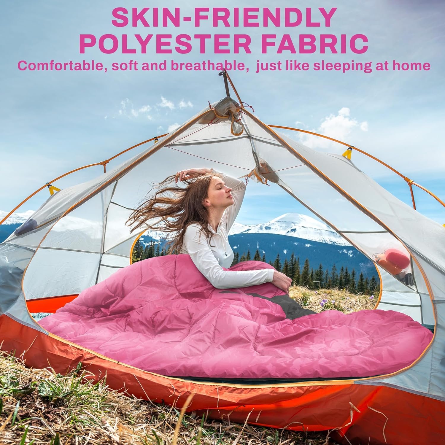 High Quality Material: It’s perfect for spring, summer, fall, and cool weather. Crafted from durable, waterproof 210T polyester outer, filler highly elastic hollow cotton for warmth retention, lining breathable and skin-friendly durable fabric, this sleeping bag shields you from moisture and wind. Whether you’re camping in mild or cooler temperatures (41°F-77°F), the hollow cotton filling provides warmth and insulation for a restful sleep