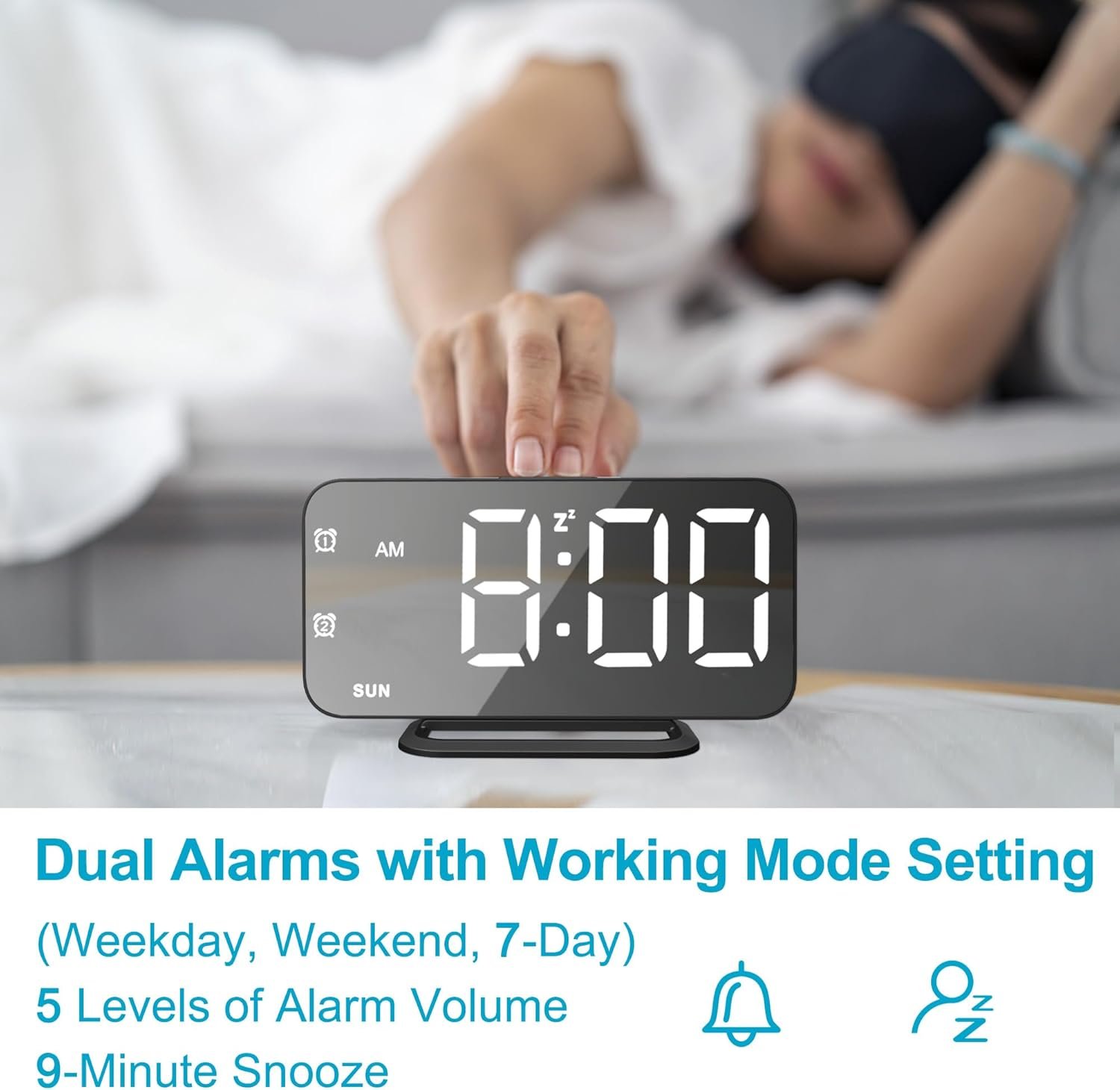 Slim LED Digital Alarm Clock, Mirror Surface for Makeup, with Diming, Large Display, Easy Setting, USB Ports, Modern Decor for Bedroom, Desk, Idea for Women, Sister, College Girl, Black