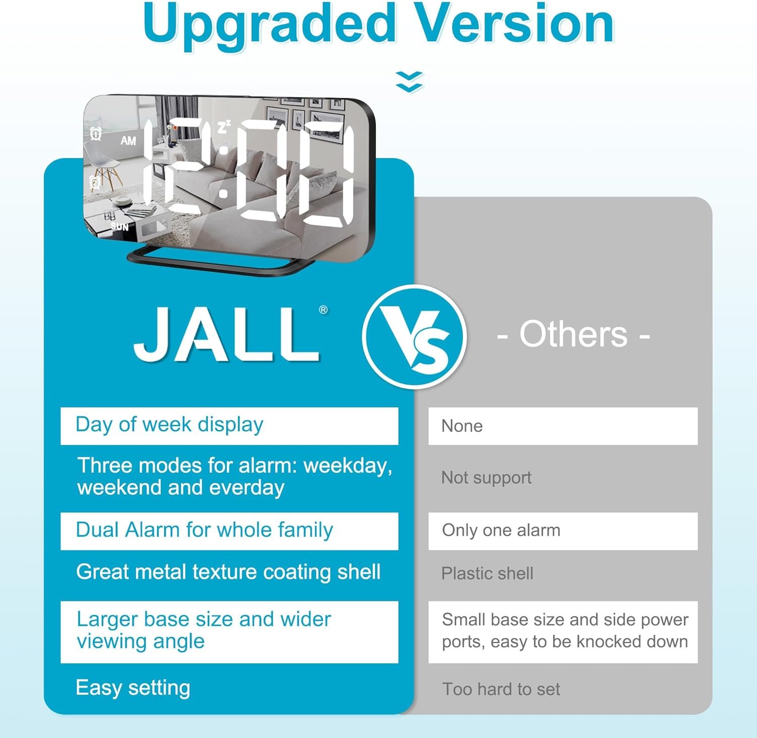 【Size and Design】About 6.7 inches (L 6.4 inches * W 3 inches) HD mirror screen display allows you to use it as a mirror to groom your looks while viewing the time. The alarm clock body has been redesigned to reduce its thickness to only 0.4 inches. Its sleek and simple design makes it both practical as an alarm clock and fashionable as a decoration.