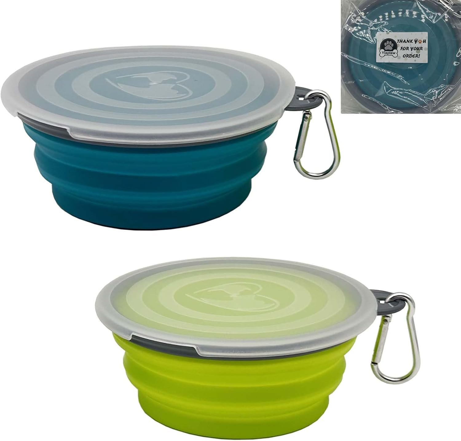 Small Collapsible Dog Bowl 12oz,2 Pack Portable and Foldable Pet Travel Bowls with 2 Carabiners & Lids for Dogs Cats and Small Animals (Blue+Green+Grey, 350ml)