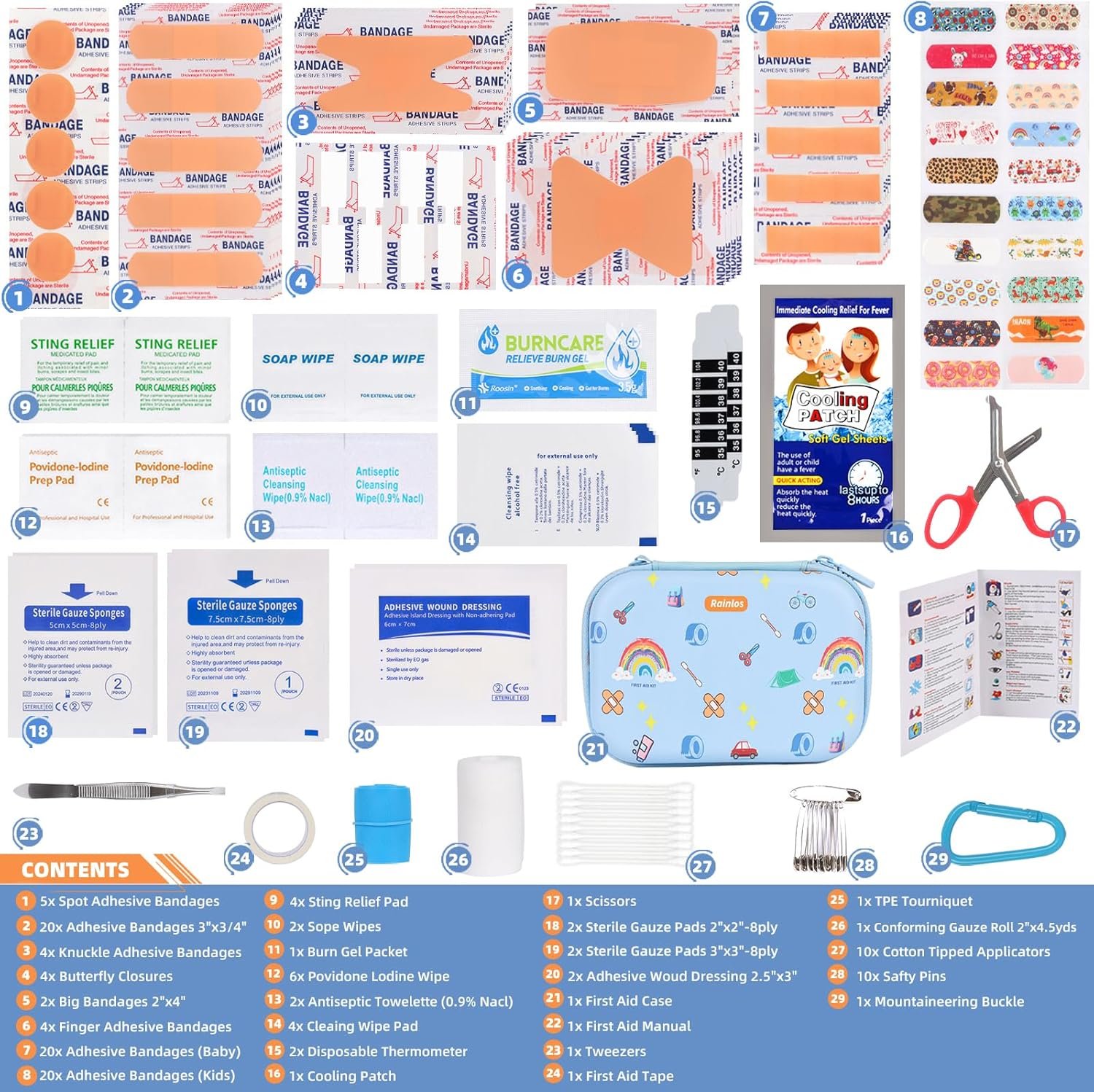 🛡【SECURITY】- RAINLOS 1st aid kit is latex-free and contains high quality hospital-grade supplies. The easy-open design and pockets help you find items quickly and also offers storage for emergency medication.