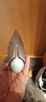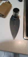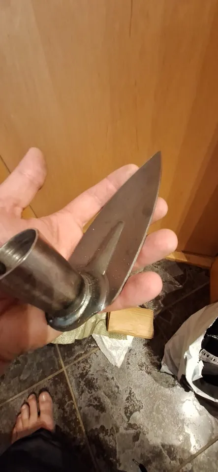 Received quickly, thank you to the seller. The shape seems good, but there is no sharpening angle, and the thickness of the handle fixing ring seems light. On the other hand, the welding of the ring on the blade is good.