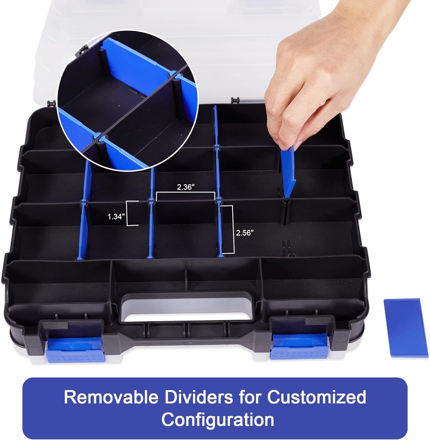 【34 Compartmets Tool Organizer】 Double side design, removable dividers are easily slide on and off to customize the storage space, for storing tools, bolts, screws, small parts, fishing tackles, crafts and many other items