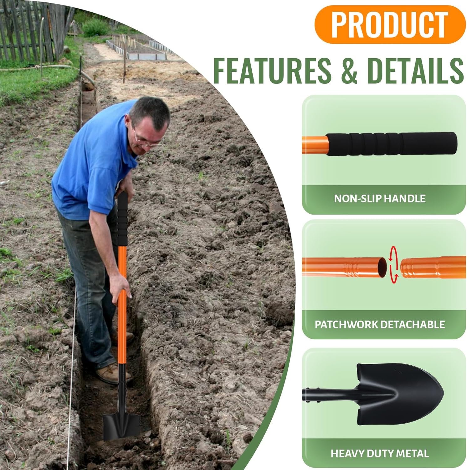 The Lightweight but sturdy design of this spade shovel allows you to carry and use with less effort. Detachable design, convenient for you to carry it far away, can be put into a backpack or car trunk.