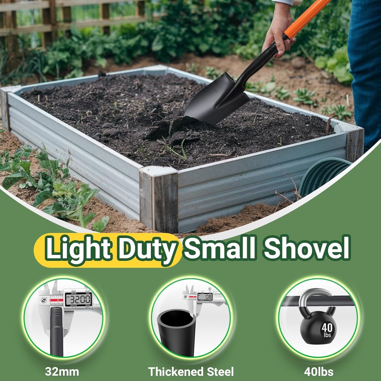 Sturdy Small Shovel: This is a small shovel for gardening digging. This small metal shovel has a sharp head to make digging more efficient and faster, the Ergonomic Non-Slip handle is made of quanlity stain steel,refuse to break and bend during the tough digging.