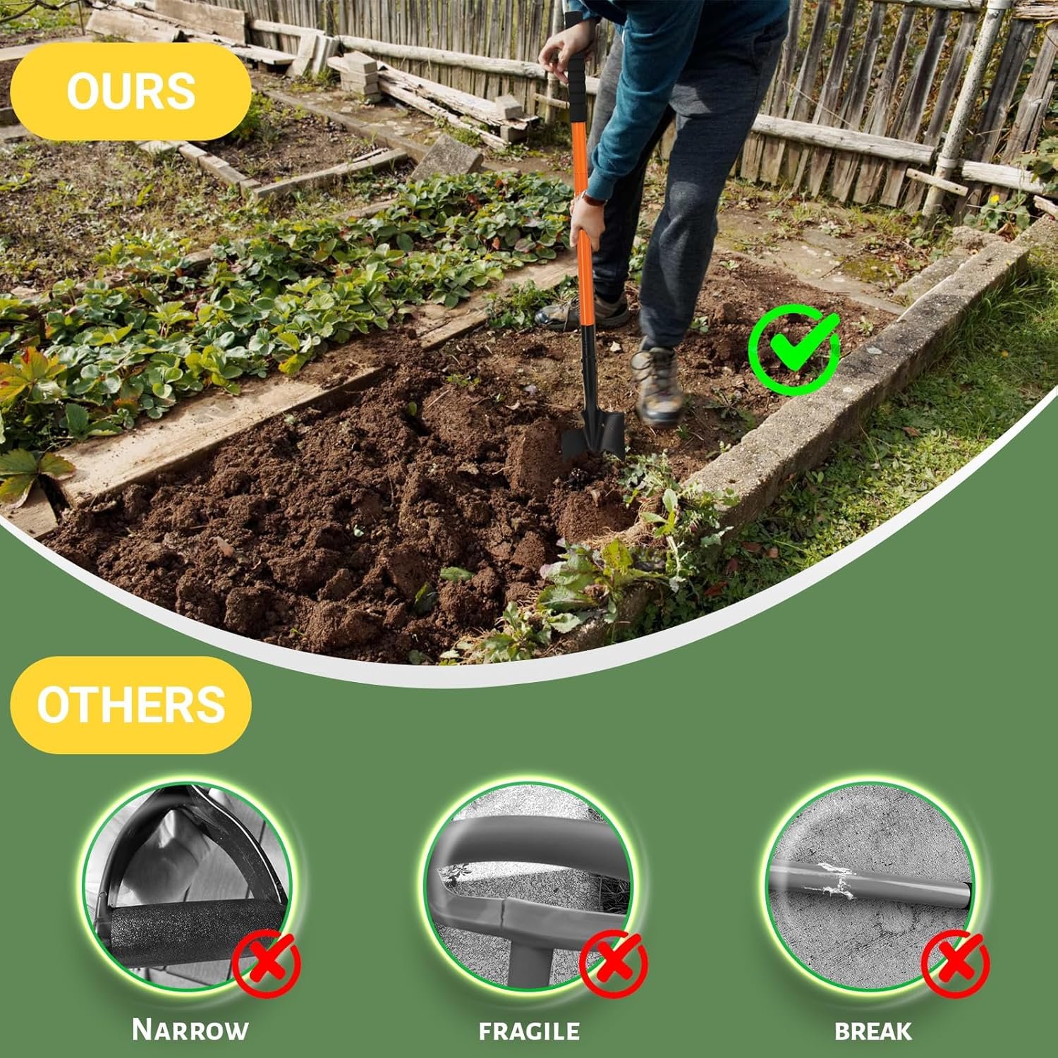 Designed with a sharp head to make digging more efficient and faster, the Ergonomic Non-Slip handle is made of quanlity stain steel,refuse to break and bend during the tough digging.