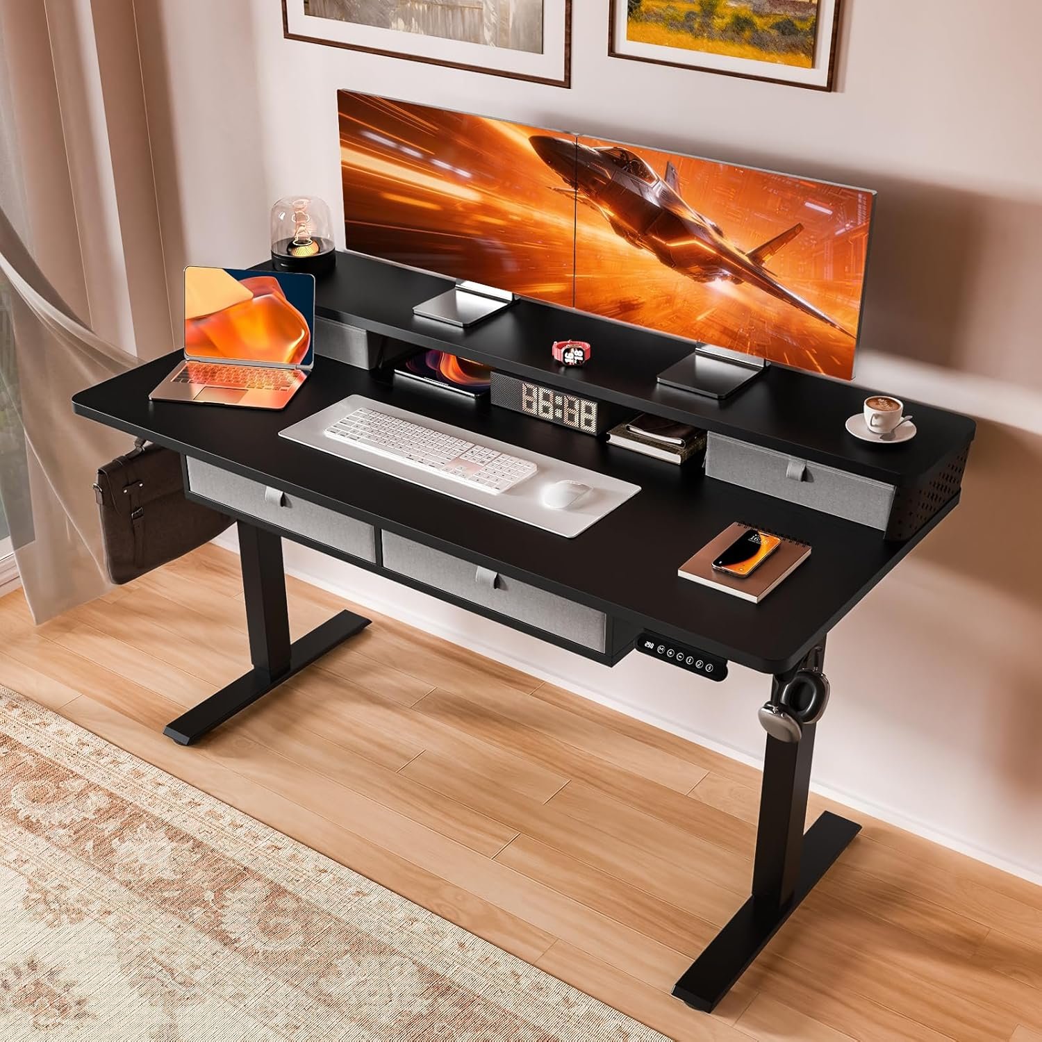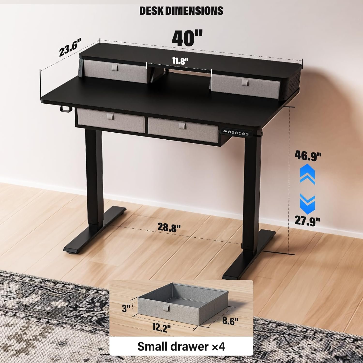 Small Standing Desk with 4 Drawers, 40″ x 24″ Electric Sit Stand Desk for Walking Pad, Ergonomic Stand Up Desk for Home Office & Gaming, 3 Memory Height Preset & Hooks(Black)
