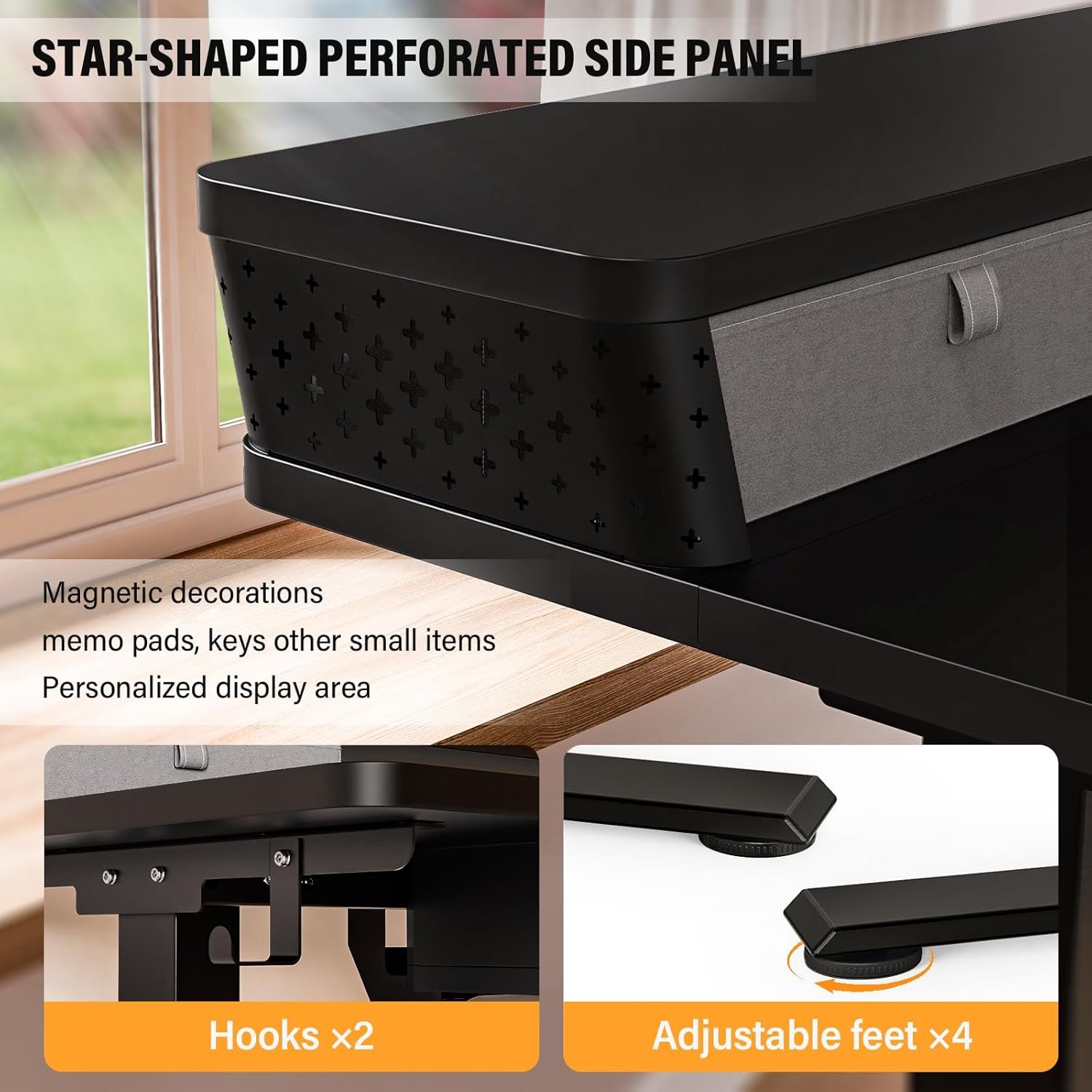 【4 Drawers + Hooks】: Our standing desk features two drawers, reducing desktop clutter by 60% and neatly organizing gaming accessories and other items. The stylish openwork side frame design not only provides ventilation but also offers space for DIY decoration.