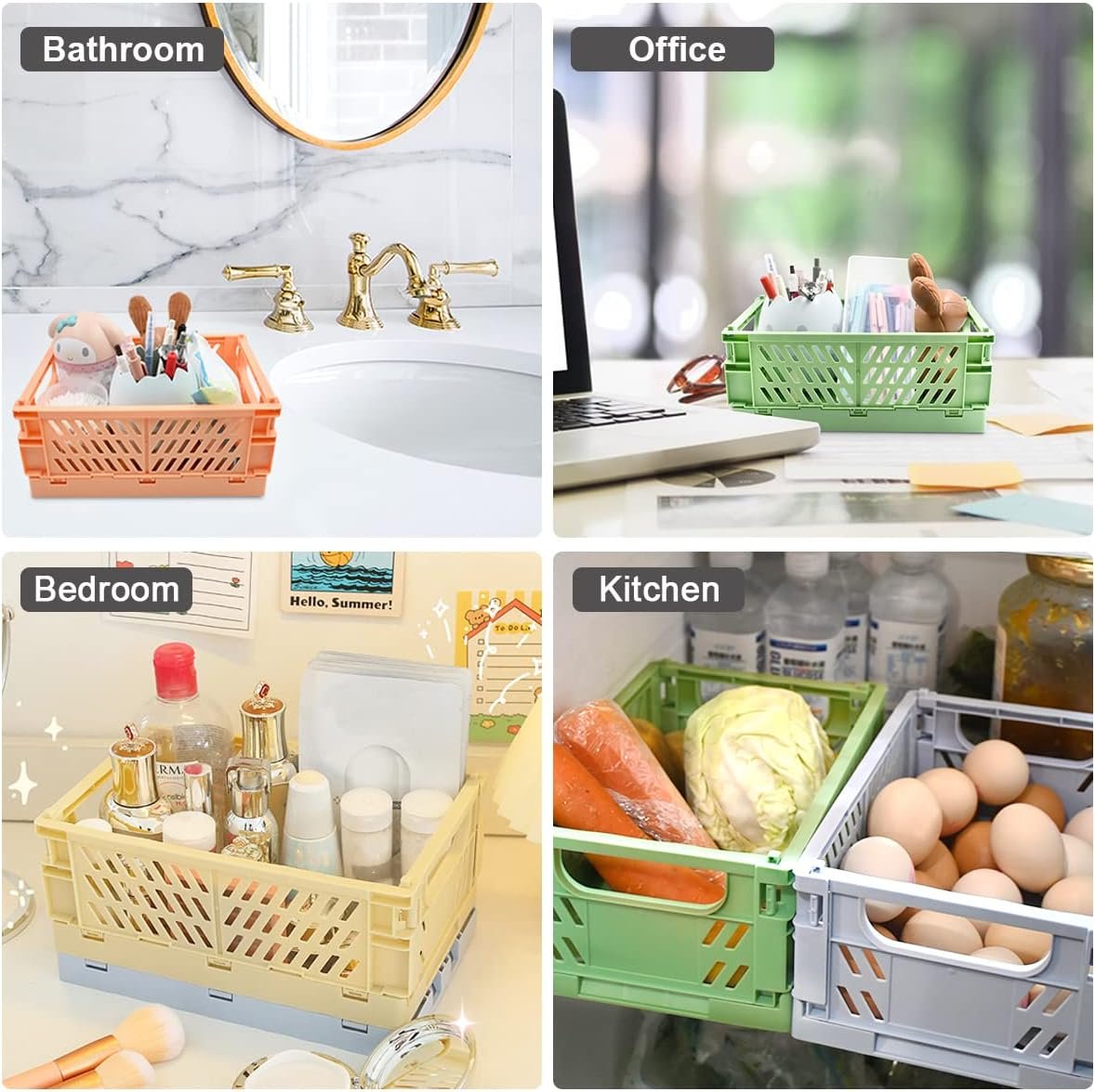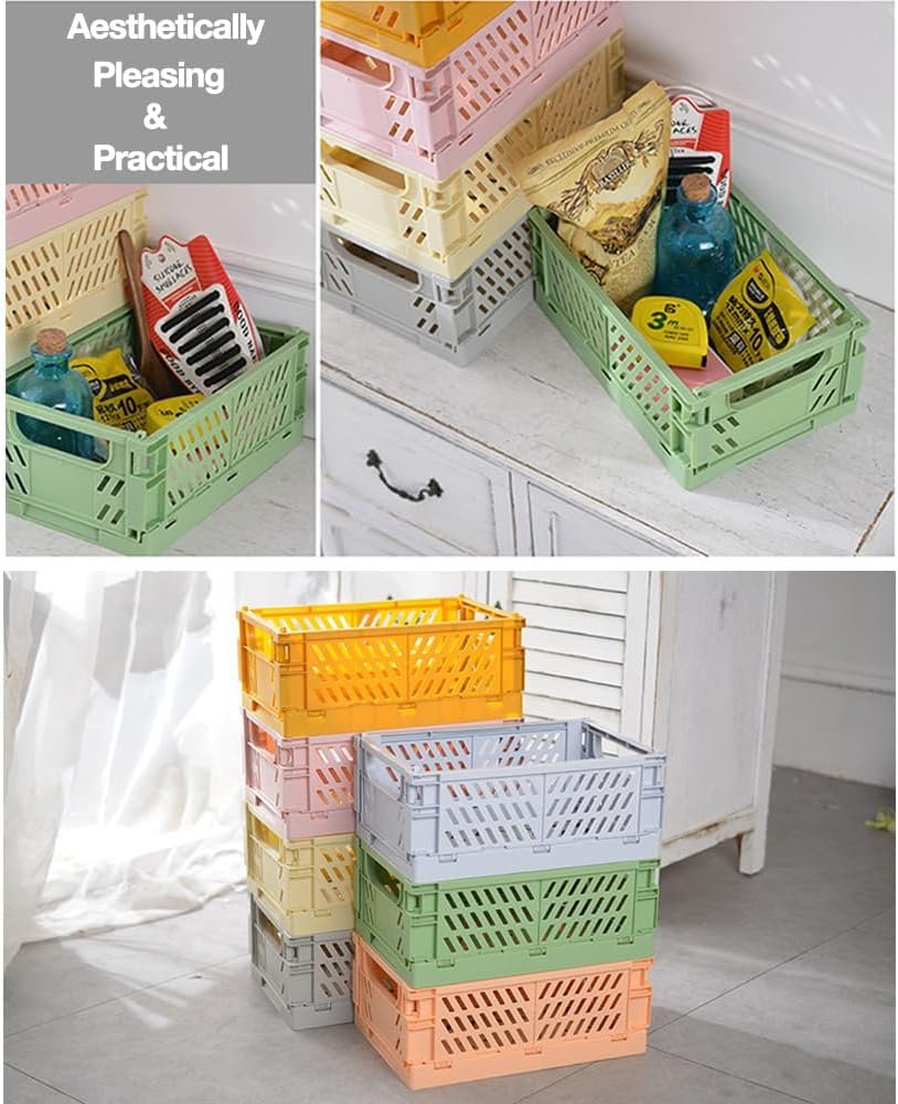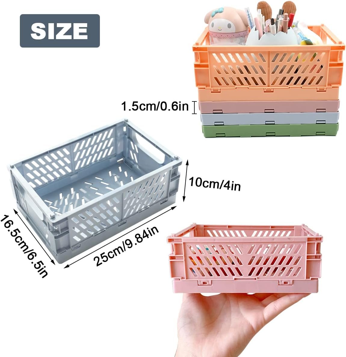 Small Storage Crates, Plastic Folding Baskets, Foldable Storage Bins, Stackable Collapsible Crates for Desk Organizing, Pastel Cute Basket Containers for Bedroom Home Office Organizer, 4Pack