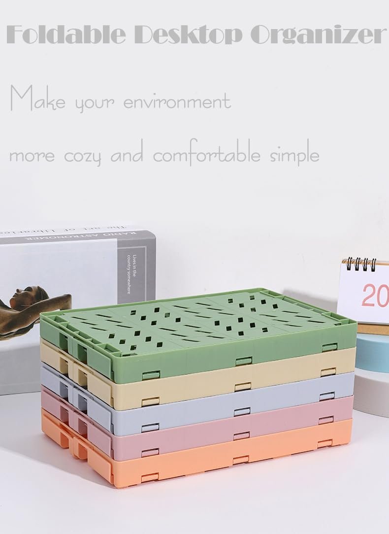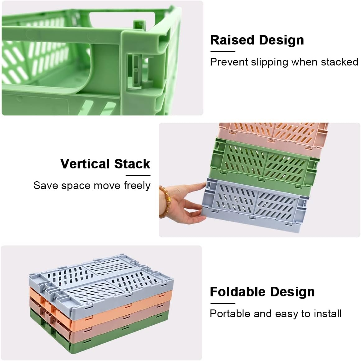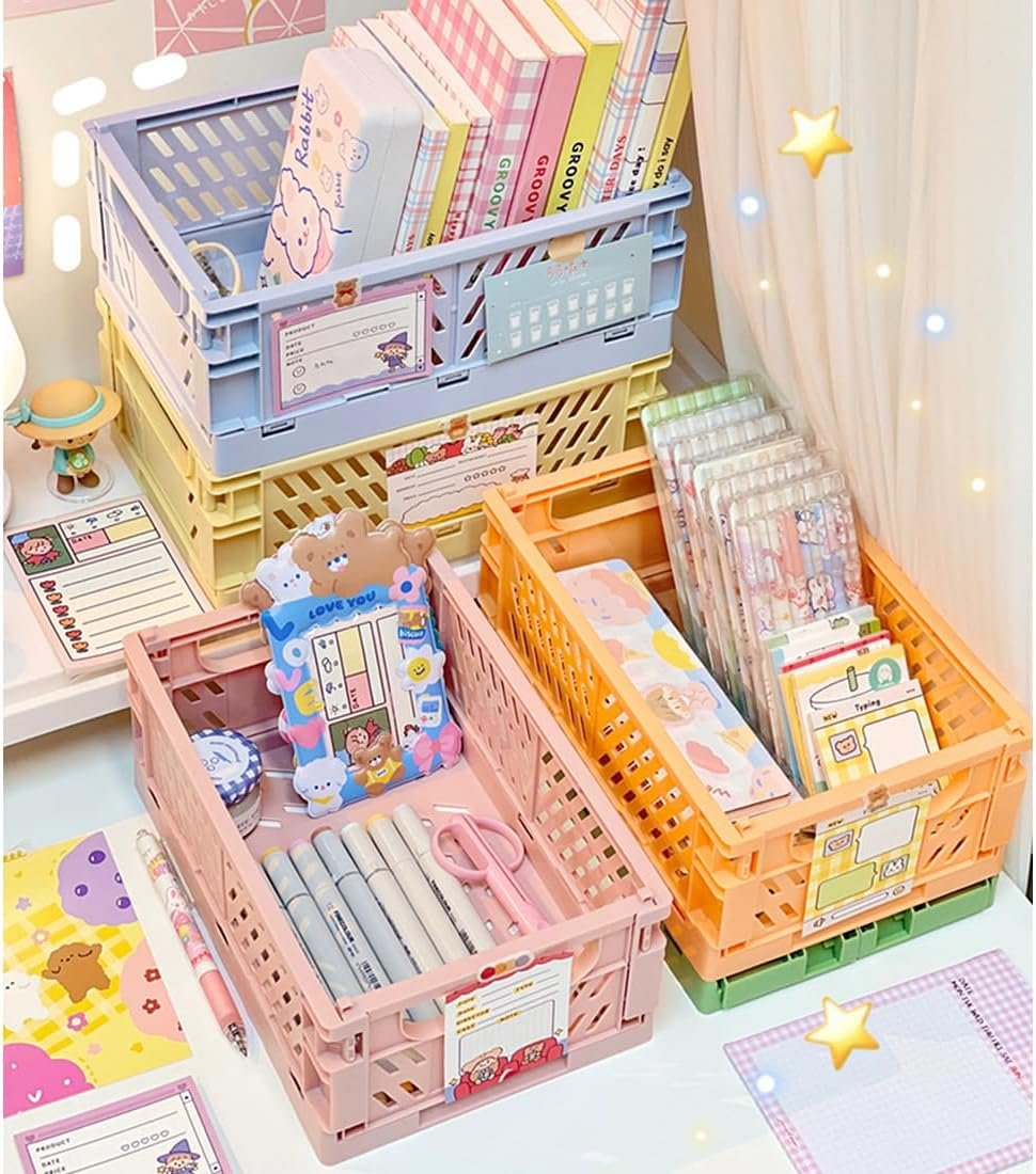 Small Storage Crates, Plastic Folding Baskets, Foldable Storage Bins, Stackable Collapsible Crates for Desk Organizing, Pastel Cute Basket Containers for Bedroom Home Office Organizer, 4Pack