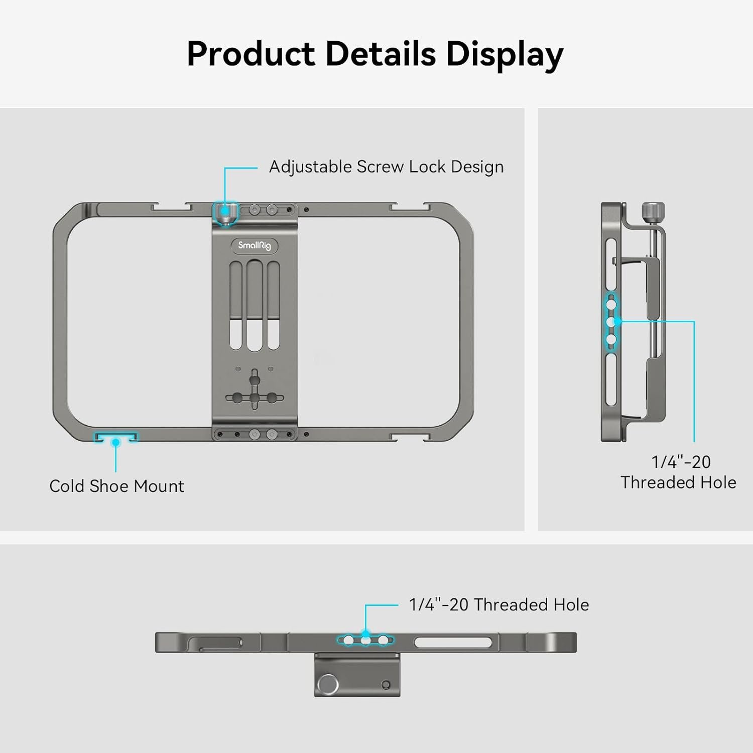【One Device Endless Possibilities】The phone cage rig comes with multiple 1/4″-20 threaded holes and two cold shoes for attaching a tripod BUT2664, smartphone side handle 3838, LED light 3286, microphone 3452, cold shoe mount adapter 3577 and other accessories.