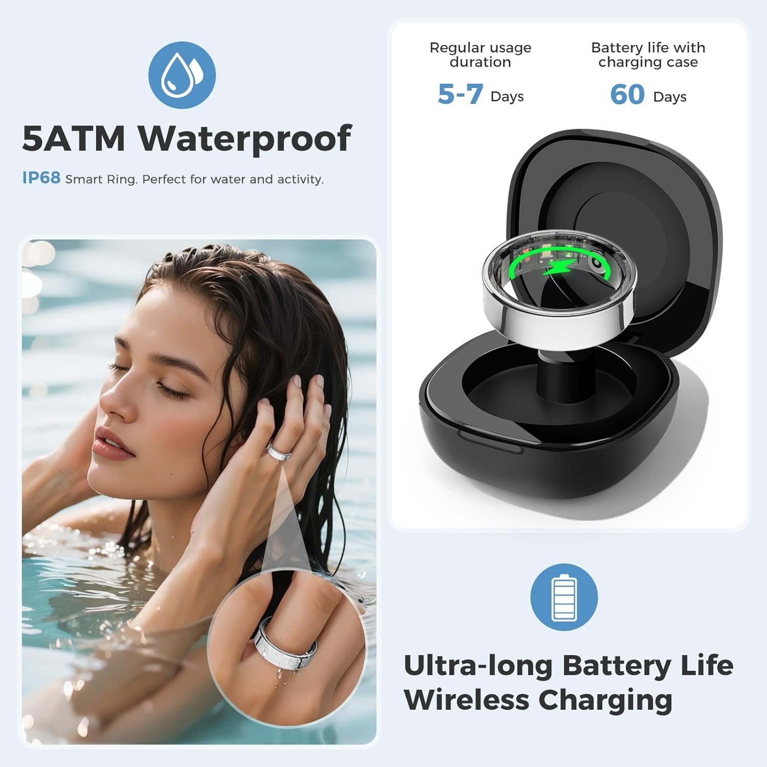 Long Battery Life & Waterproof: Enjoy up to 7 days of use, extendable to 60 days with the charging case, and IP68 waterproofing for worry – free wear during workouts or rain