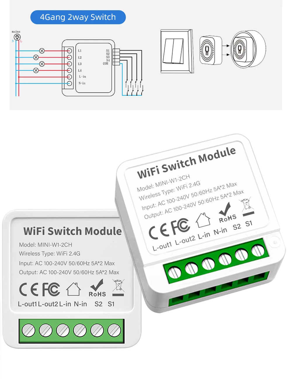 It can also be connected behind the switch to support single control switch and dual control switch. It can be directly installed in the switch box to hide the switch module. It can also be installed on the dual-control switch without affecting the use of the dual-control switch.