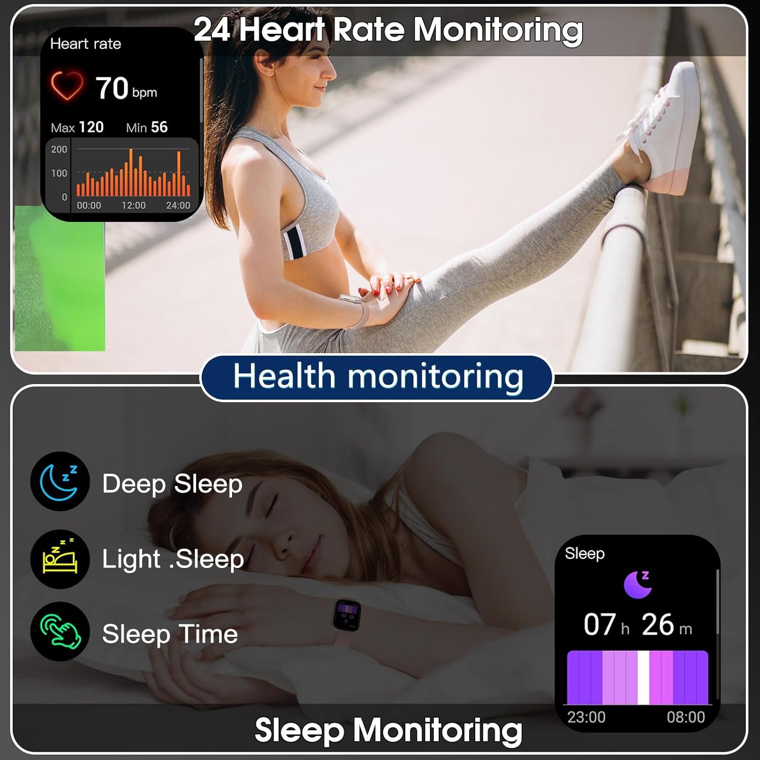 Monitor Your Health 24/7: T80 mens womens watch uses advanced sensing chips and photoelectric sensors for precise monitoring. The smart watch can monitor heart rate in real time 24 hours a day. Always pay attention to your physical health. The men’s smart watch automatically monitors your sleep status (deep sleep, light sleep, awakening) and provides comprehensive sleep quality analysis to help you better understand sleep changes.