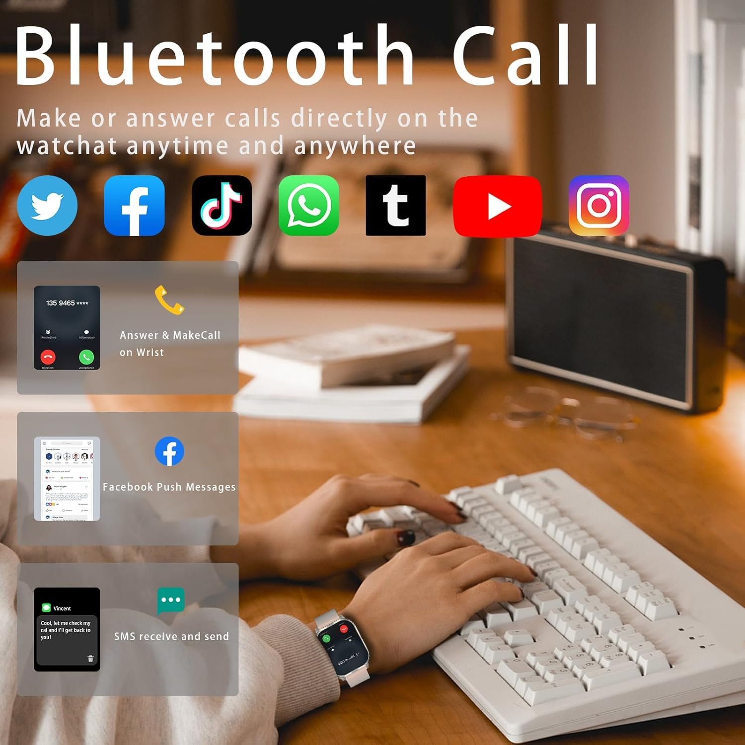 1-“Bluetooth Calling and Message Reading: This smart watch has an HD speaker for calls. Connect via Bluetooth to answer or make calls, view logs, and save contacts. The activity trackers and smartwatches alert you to social media messages like Facebook, WhatsApp, Instagram, and more