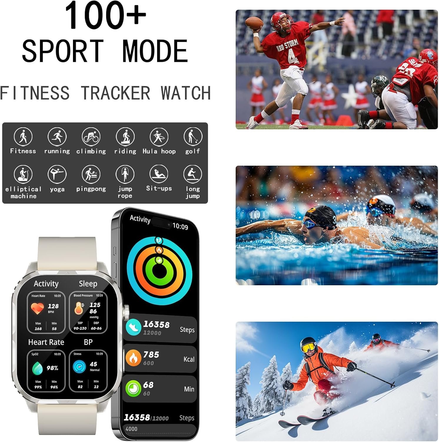 4-Waterproof watches for men support 100+ sports modes like running, cycling, and yoga. The fitness tracker watch records steps and calories burned. The IP68 waterproof smart watch for women ensures safe use during handwashing, face washing, or intense sweating