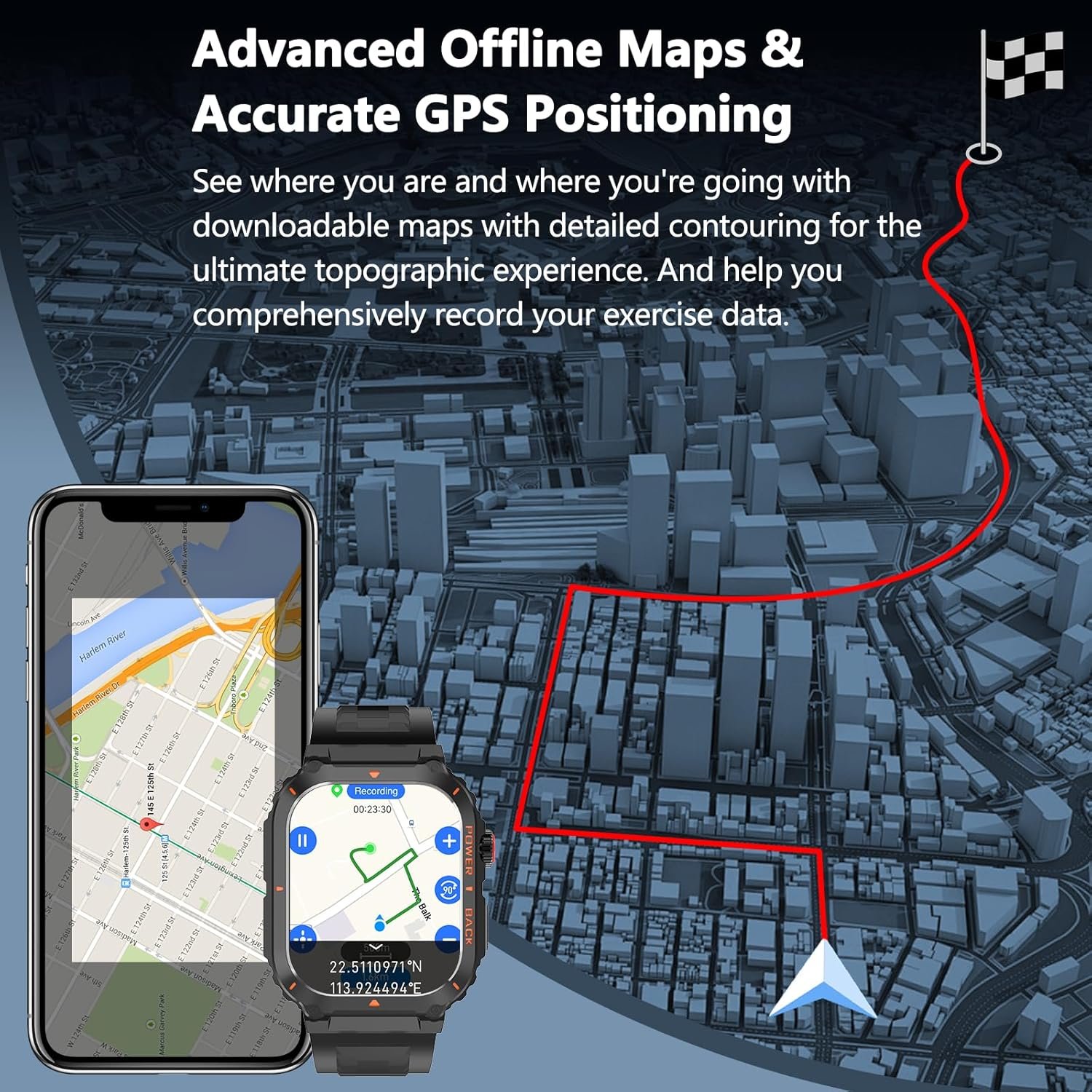 ADVENTURE-READY NAVIGATION – Built-in GPS and maps, real-time elevation tracking, and military-grade compass for hiking, biking, and outdoor exploration (IP68 waterproof rating). The smart watch is a top-of-the-line device specifically designed for outdoor adventure and health enthusiasts. Our advanced GPS navigation system and elevation tracking transforms your watch into a wilderness survival tool. The built-in compass with magnetic declination calibration ensures precise orientation for adventurers. Never Lose Your Way.