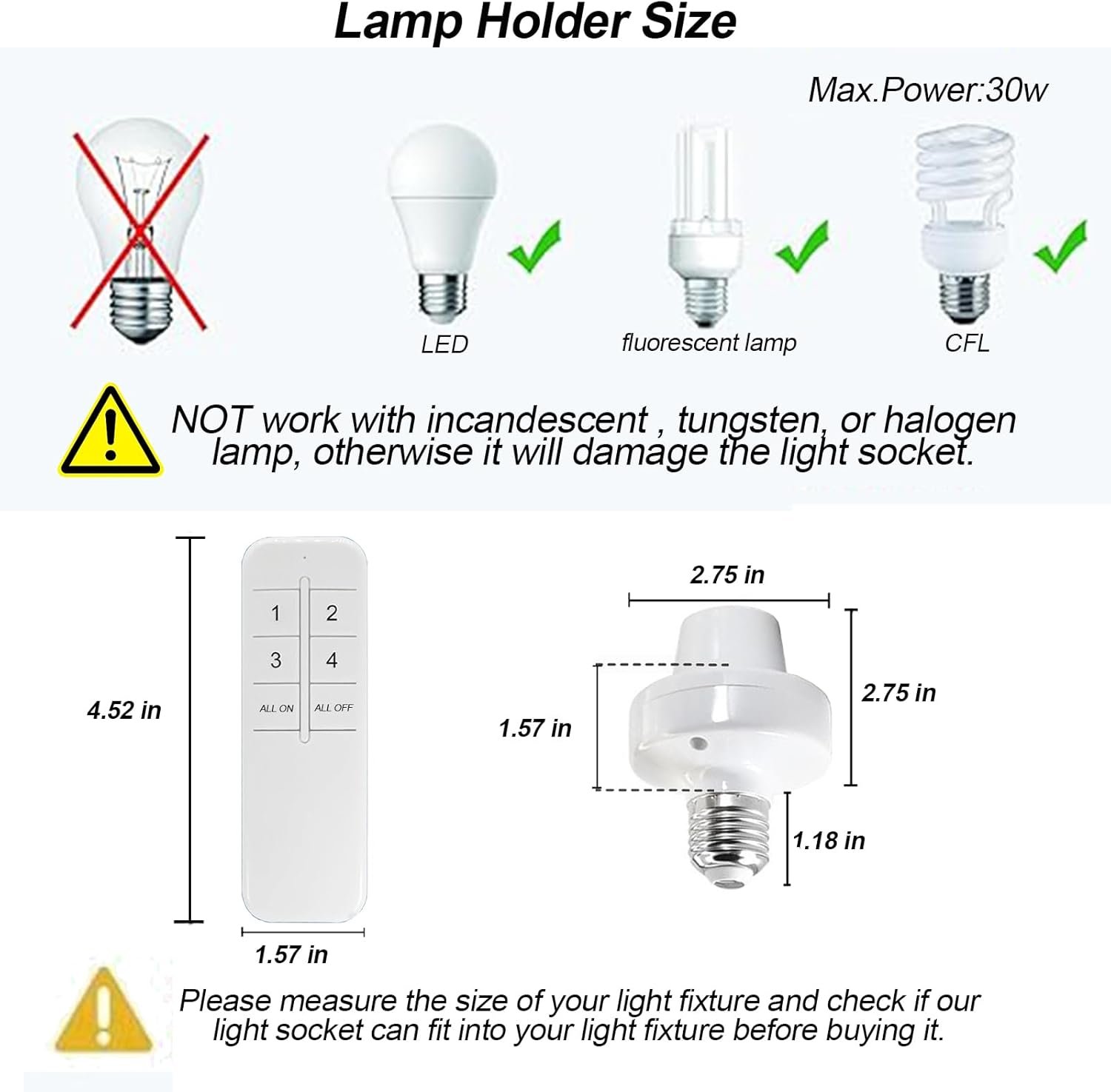 【Wide Compatibility】: Smart Light Bulbs work with most E26 E27 light bulbs including LED Bulb, Smart Bulb, CFL Bulb, Fluorescent Bulb, Corn Light Bulb etc., but NOT Incandescent Bulb, Halogen Bulb, or Tungsten Bulb / voltage 100-120V AC, max load 2.5 amp, max power 30W