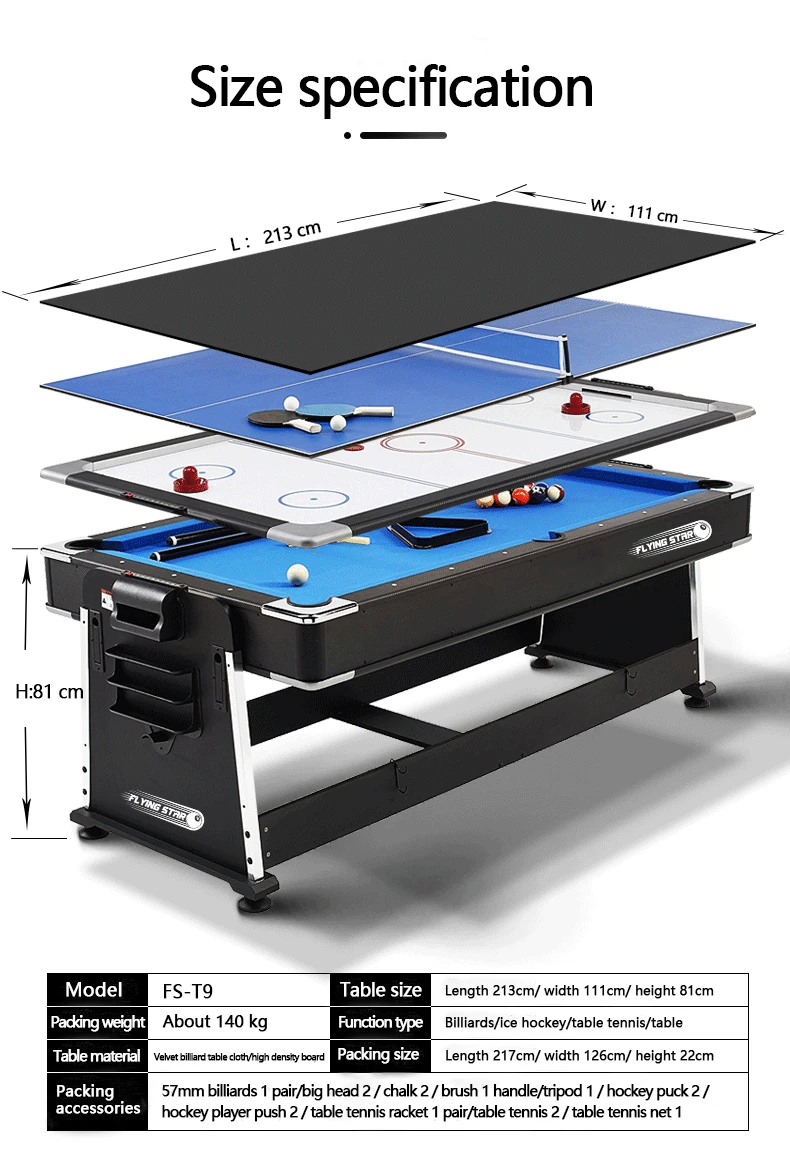Package accessories: a box of 57mm billiard balls, 2 billiard cues, 1 tripod, 1 brush, 2 chocolates, 2 hockey pucks, 2 hockey pucks, 2 table tennis rackets, table tennis 2 table tennis balls,