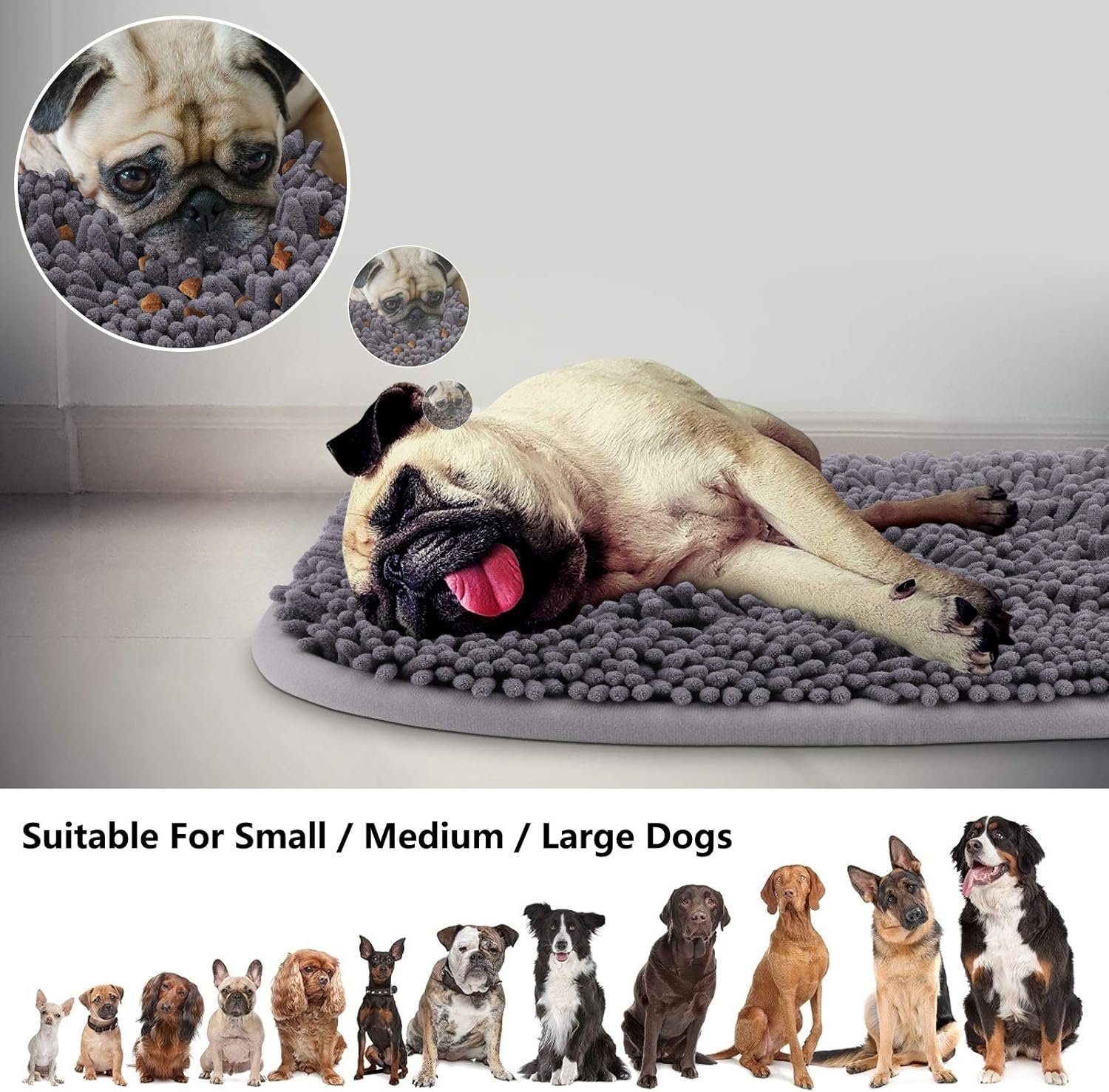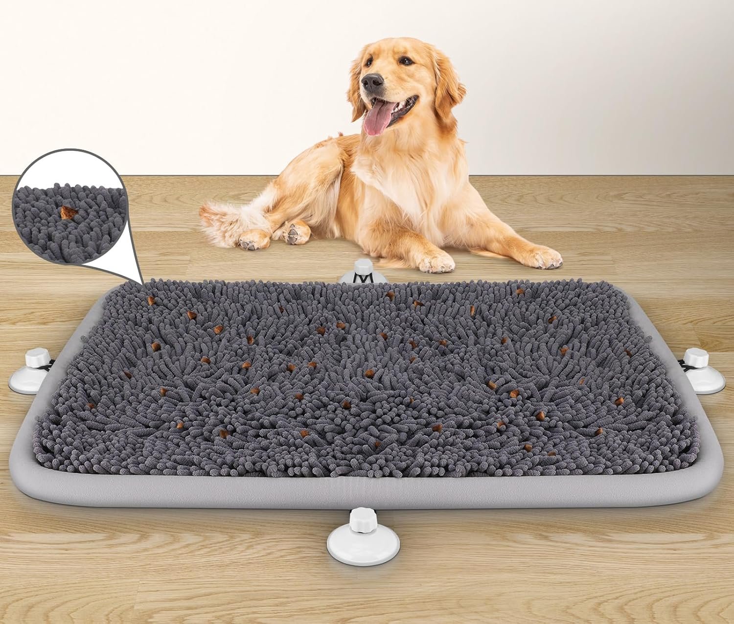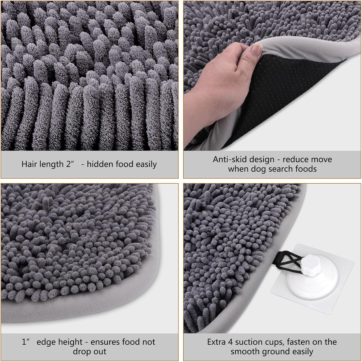 It comes with 2 suction cups, you can fix the mat on smooth ground. Thicker hair helps to hide food easily, help dogs to train their smell ability.
