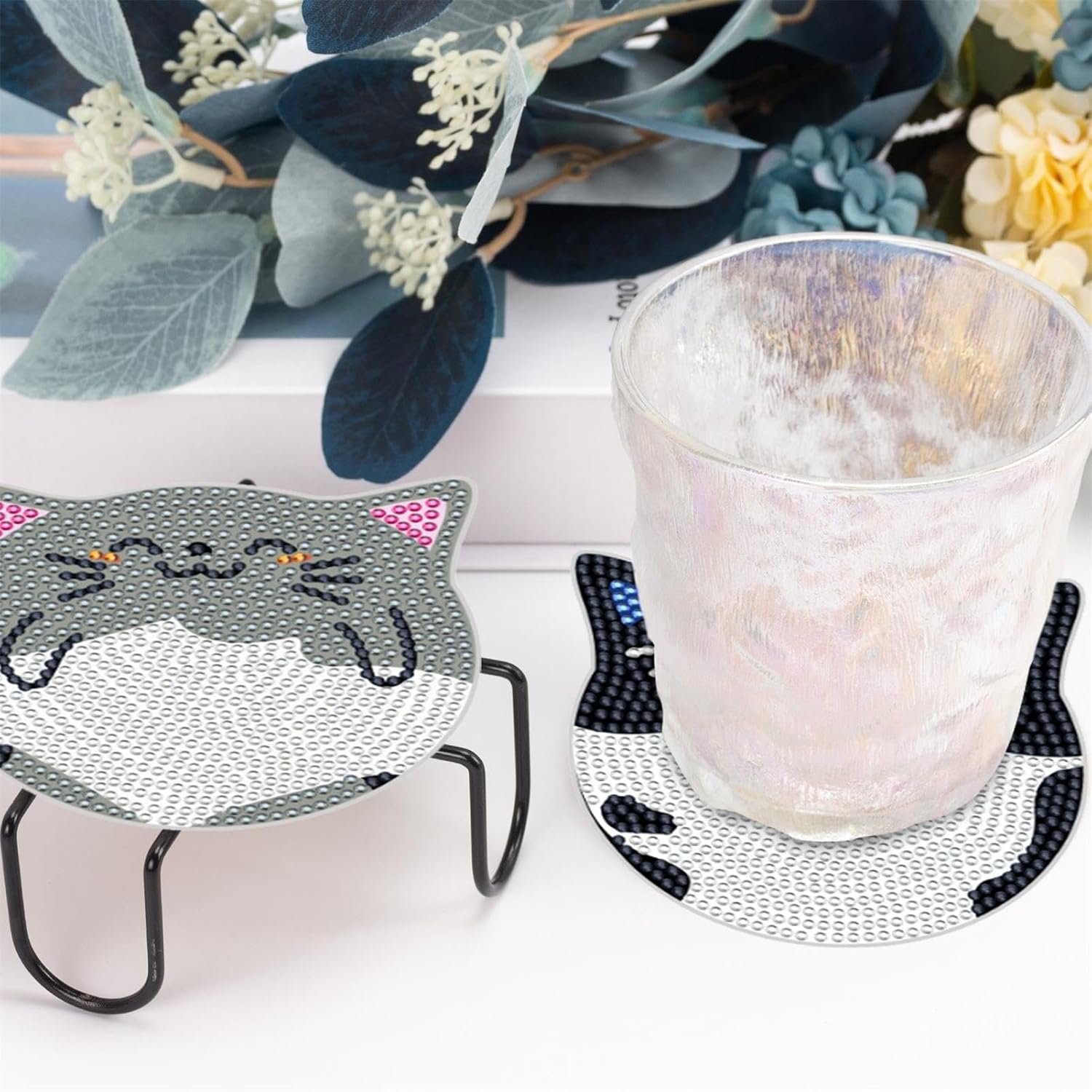 SOEWIOU 6 Pcs Cat Diamond Painting Coasters Kit with Holder – DIY Craft Kit for Adults, Fun Diamond Art for Home Décor & Drink Coasters