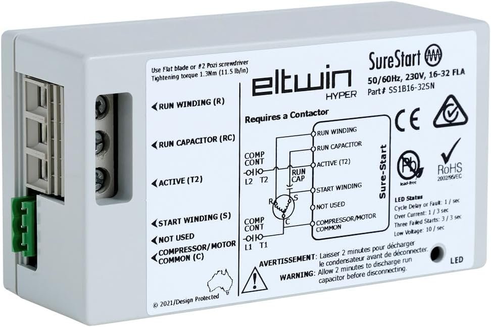 This product has been developed specifically to soft start large single phase compressors and motors. It provides a dramatic reduction in the starting current but still provides full start torque. Please consult the FLOW CHART image for help selecting the correct unit.