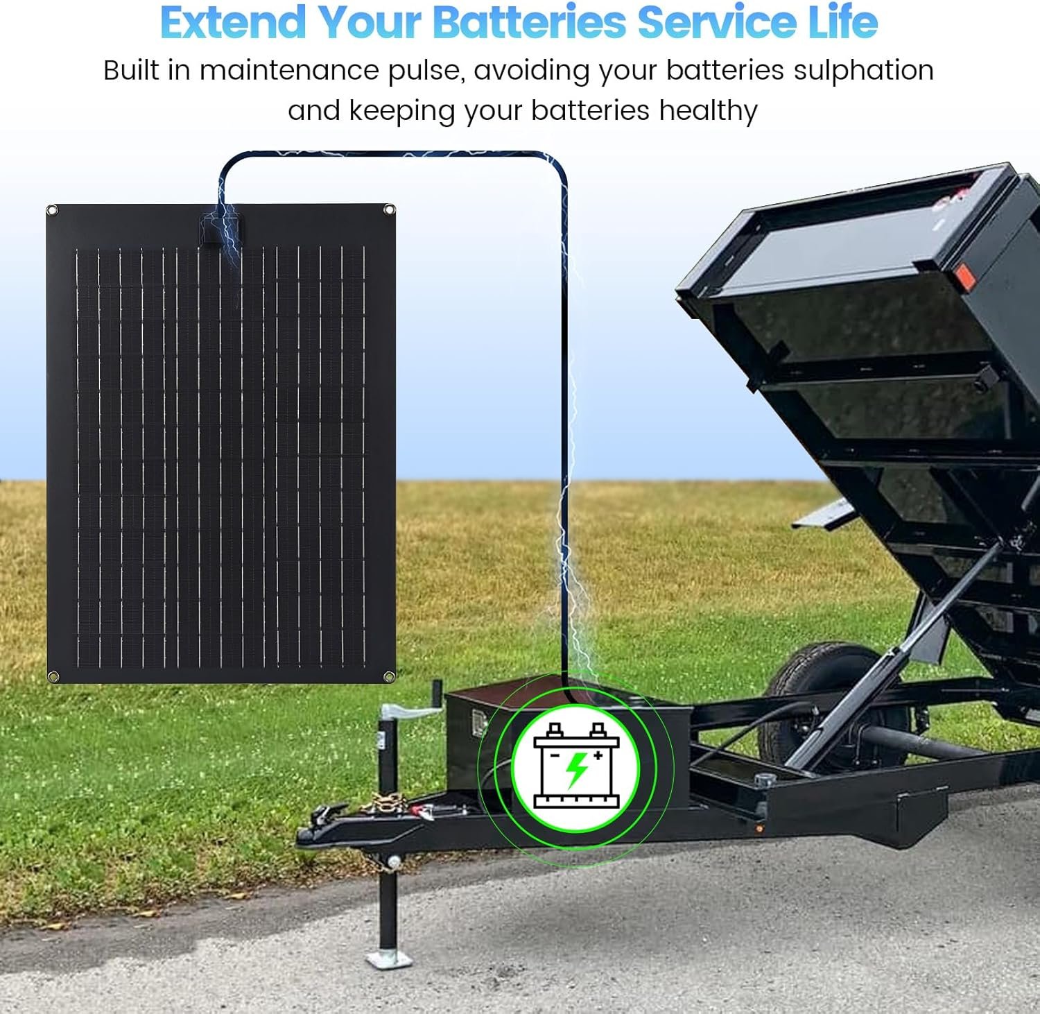 EXTEND YOUR BATTERIES SERVICE LIFE: As we all know, battery acidification is the number one cause of battery failure. Our 20W solar battery maintainer has a built-in maintenance pulse for when the battery is about to be fully charged, avoiding the situation of battery sulphation and keeping your dump trailer battery healthy