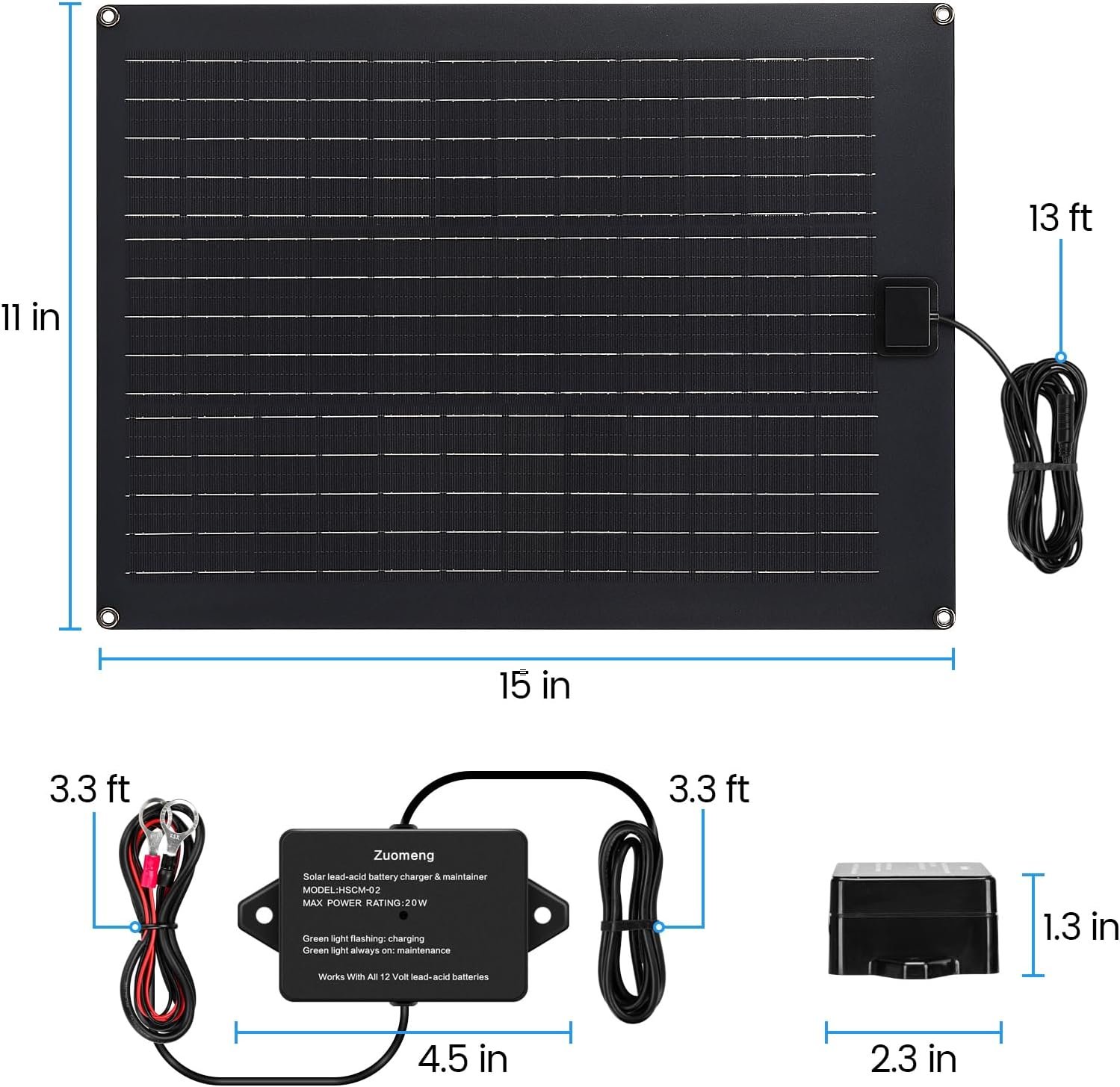 Solar Battery Charger Maintainer, Zuomeng 20W Solar Panel Kit for Dump Trailer Built-in Maintenance Pulse & Intelligent MPPT Charge Controller, Waterproof, Suitable for 12V Lead-Acid Battery