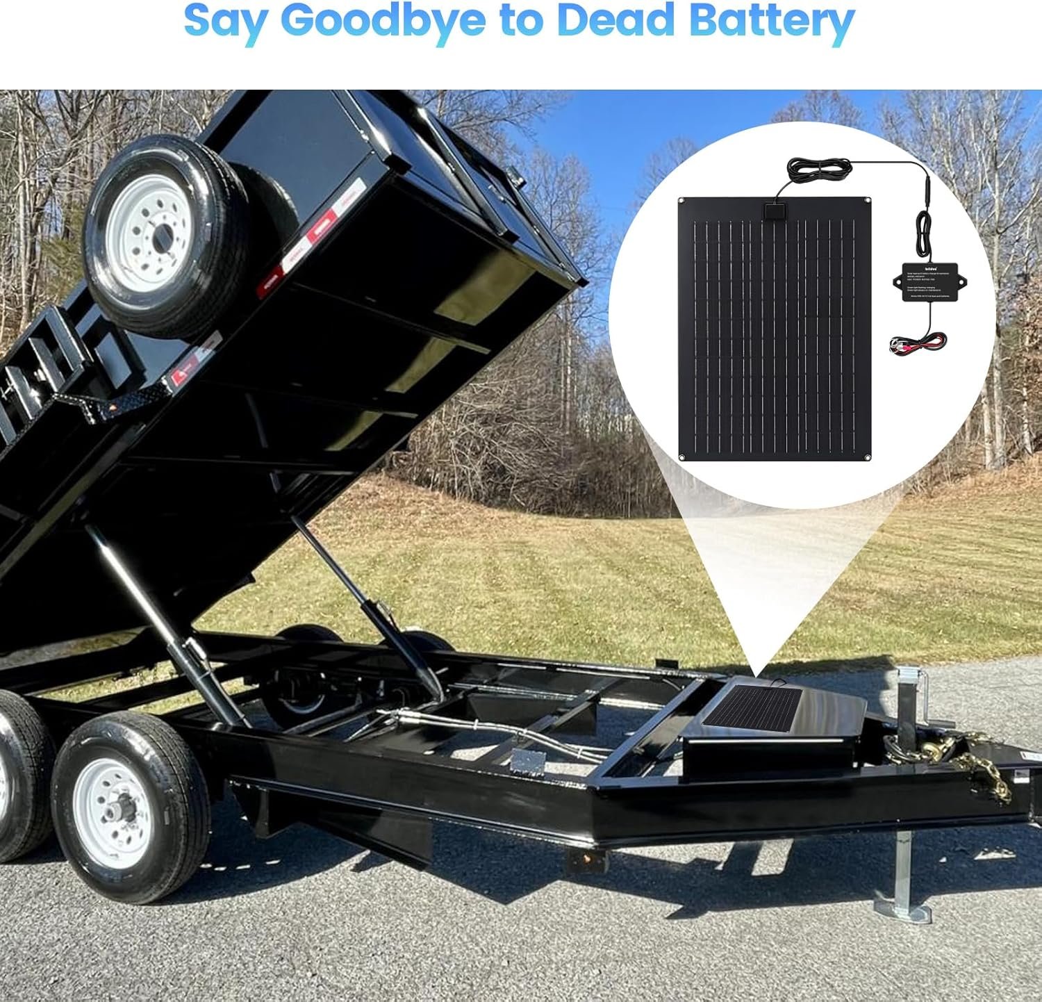 EFFICIENT & WATERPROOF: The dump trailer solar battery charger uses 20W high-power semi-flexible monocrystalline silicon panels that are more efficient and thinner than other products, more durable and easier to store. At the same time we upgraded water resistance, perfect for outdoor use, maintenance free, save you time and money