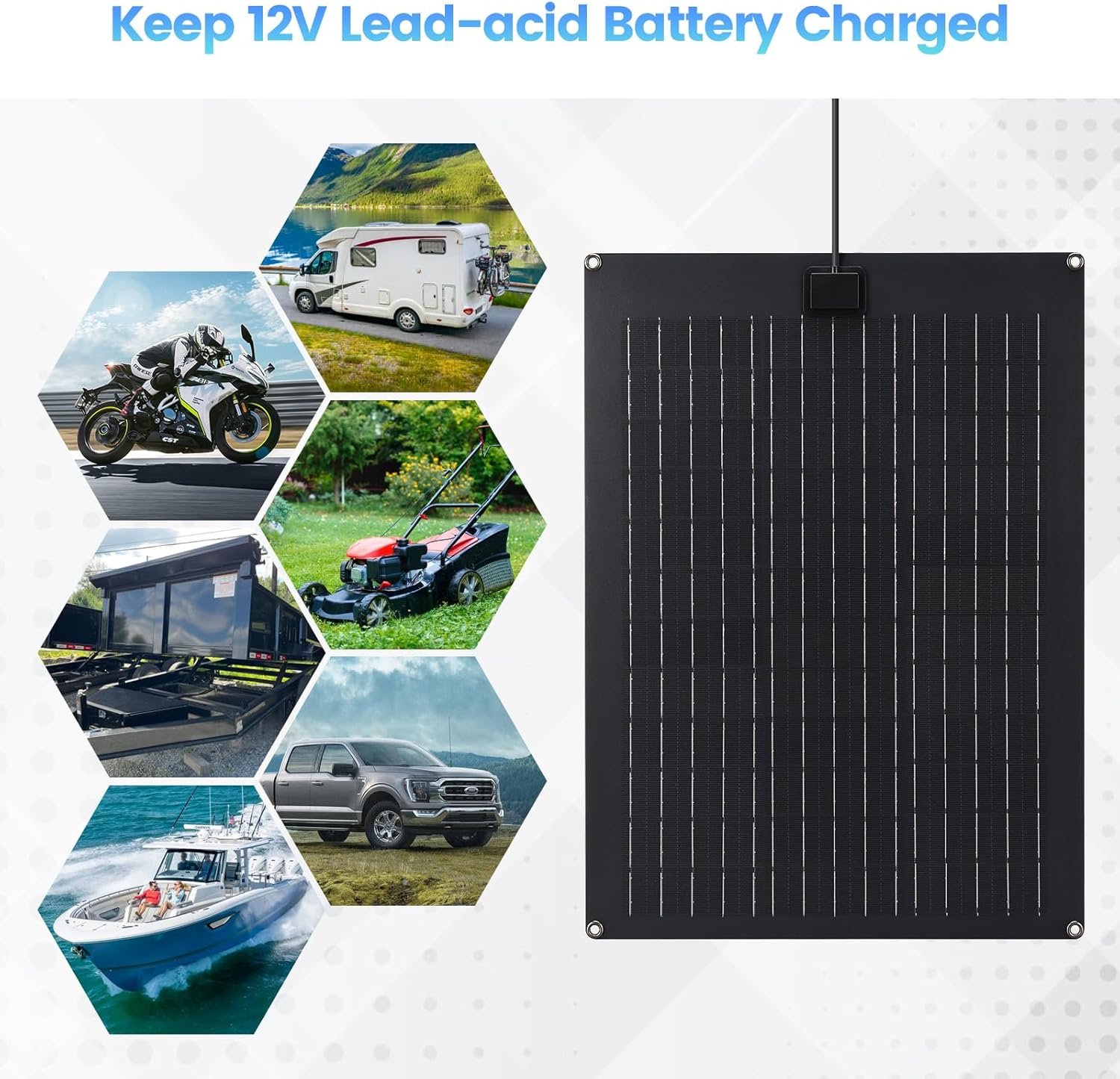 WIDE APPLICATION: The solar battery charger 12 volt waterproof includes screws and nuts that allow you to securely attach the solar battery maintainer to your trailer. Suitable for any trailer, truck, car, RV, tractor, lawn mower, motorcycle, boat, etc. using 12V lead-acid battery