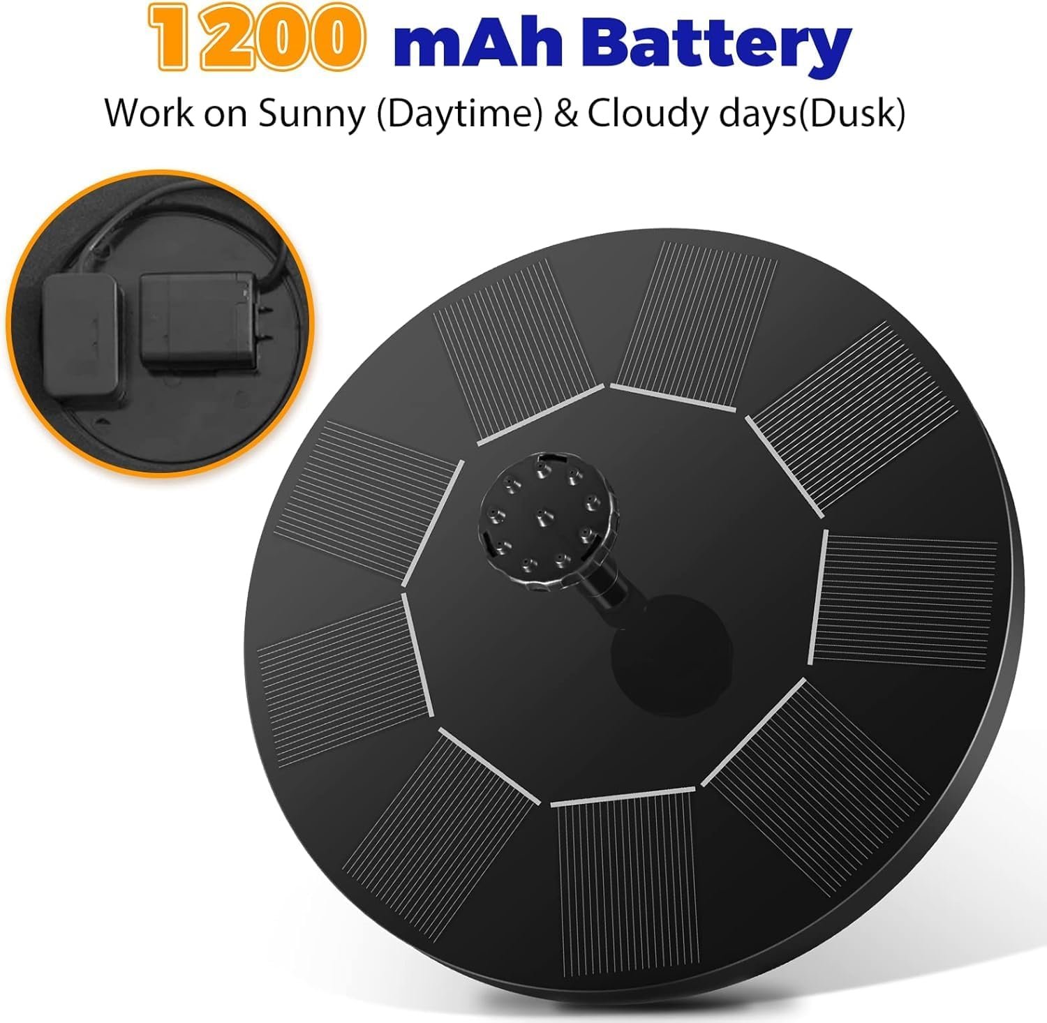 ☀【Upgrade 1200mAh Built-in Battery】This solar fountain pump has a built-in 1200 mAh battery, which automatically stores solar energy. This solar fountain can work continuously for 3~4 hours even in cloudy days.