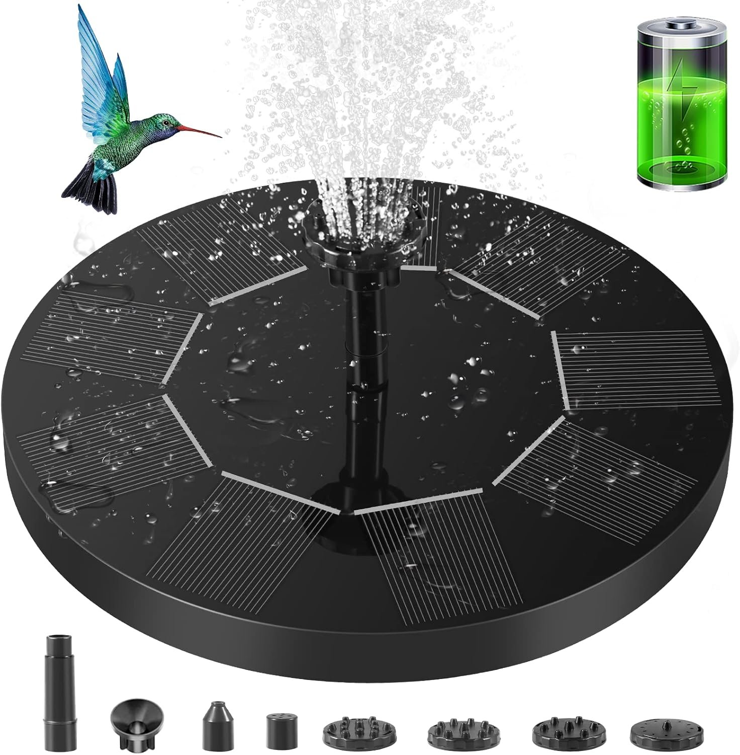 ☀【6 Different Spray Heads】The solar water pump has 6 different water spray modes, which allow the device to change the spray height and water pattern. This solar water fountain is the perfect addition to your garden or yard, the sprayed water attracts birds, butterflies and dragonflies, bringing so much life to your garden.