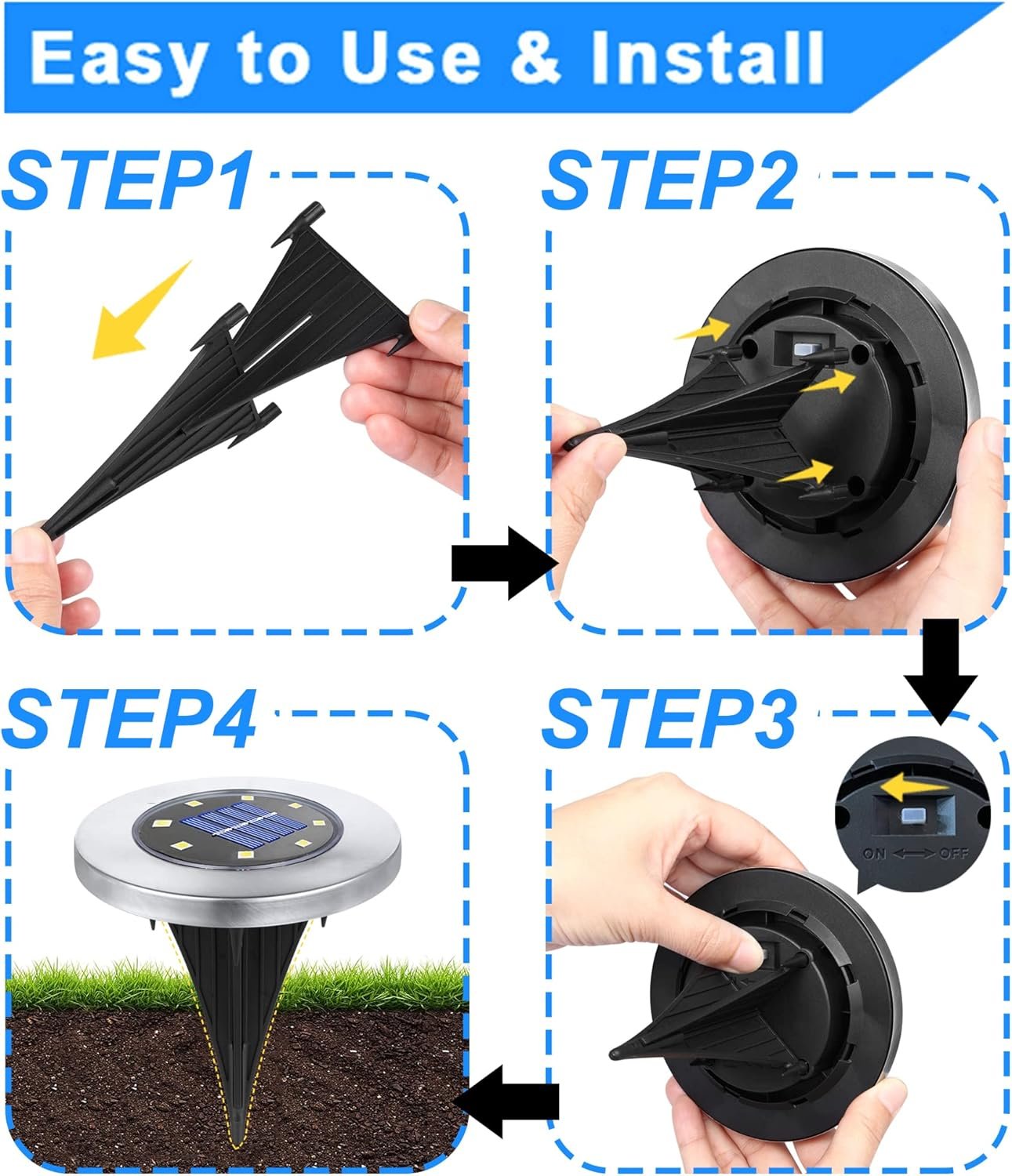 Light up any place: Disk Lights provide perfect lighting for your courtyard, flower bed, gardens,backyard, walkways, pathway, yard, driveway, lawns and corridors, etc. to add a beautiful night scene scene. Just place the step lights where light is needed at night. No need to change cables or batteries, use free solar energy