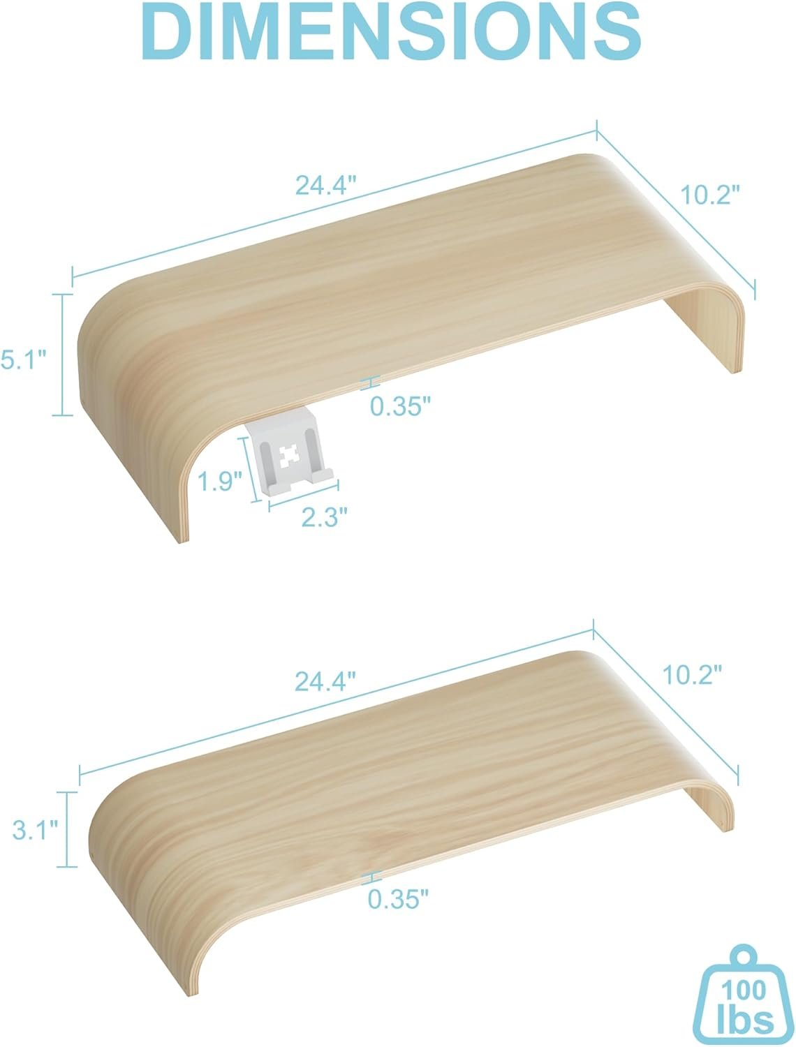 Dual Wood Desktop Stand – Made of 0.4 inch thick solid wood, this dual monitor stand supports up to 110 lbs. The upper tier (24.4″×10.2″×5.1″) and lower shelf (23.6″×10.2″×3.1″) fit laptops, printers, and heavy desktop gear