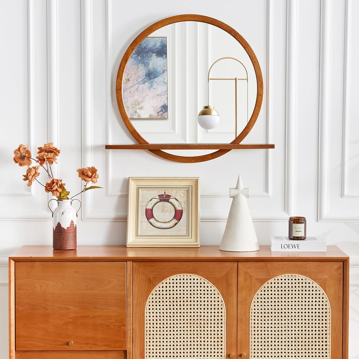 Solid Wood Wall Mirror with Shelf – Round Wood Frame Mirror for Entryway, Bathroom or Living Room – Handcrafted Look – 24 Inch